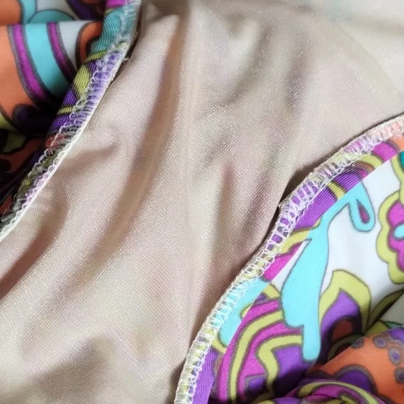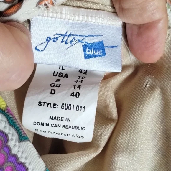 I've been purchasing GOTTEX Swimwear for decades and have never seen the GOTTEX blue label before! Have to search for info but can only say how very Peter Max or Vintage Pucci the print and colors are which makes me believe it's 1960s Vintage. Additionally, it runs small - true to form for Vintage swim and other garments.