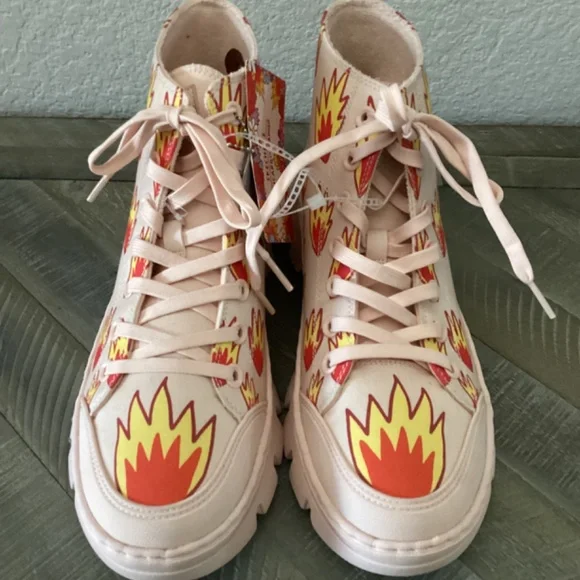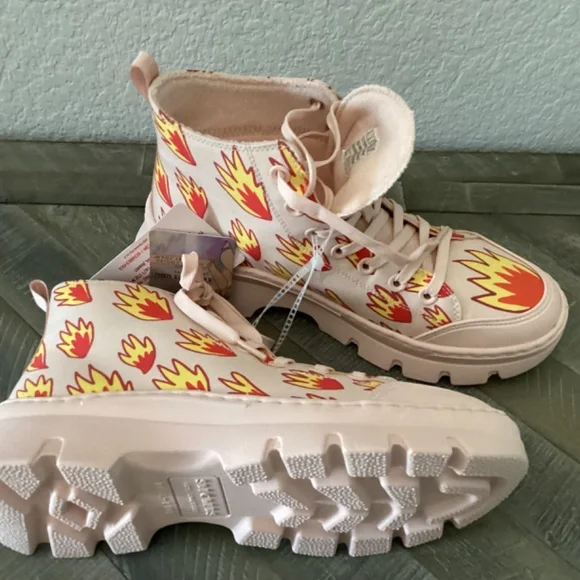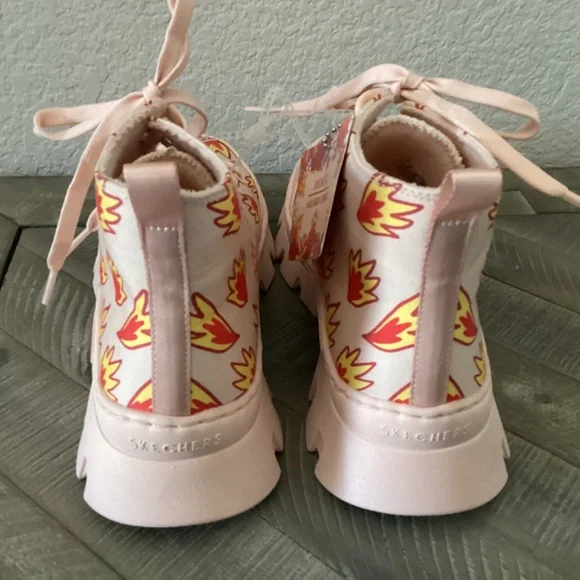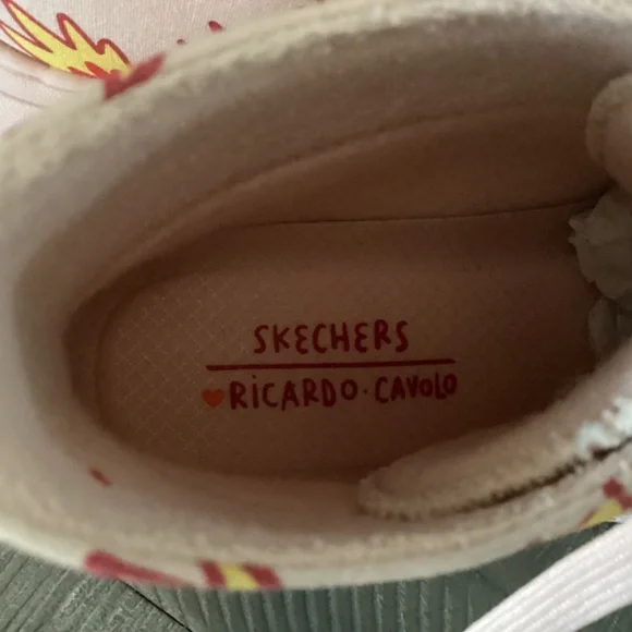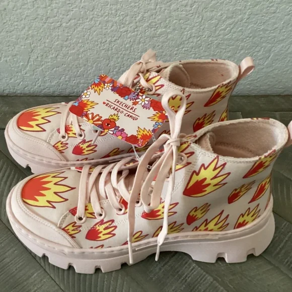 New without box.Elevate your athletic style with these NWT Skechers Women's Ricardo Cavolo: Roadies Surge sneakers. The high top shoe shaft style and lace-up closure provide a secure fit for any activity. The pink flame pattern adds a pop of color to your workout wardrobe. These sneakers feature the Skechers Memory Foam product line and are designed with a standard shoe width. The stylish design and comfortable fit make these shoes perfect for any woman looking for a high-quality athletic shoe.