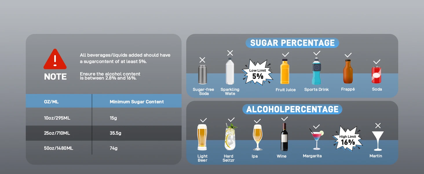 Important Usage Tips:The sugar content should exceed 5%, and the alcohol content should be between 2.8% and 16% for best results.Always stir the mixture thoroughly before pouring it into the machine.Need help? Contact our support team—we’re here to provide a prompt and satisfactory solution.