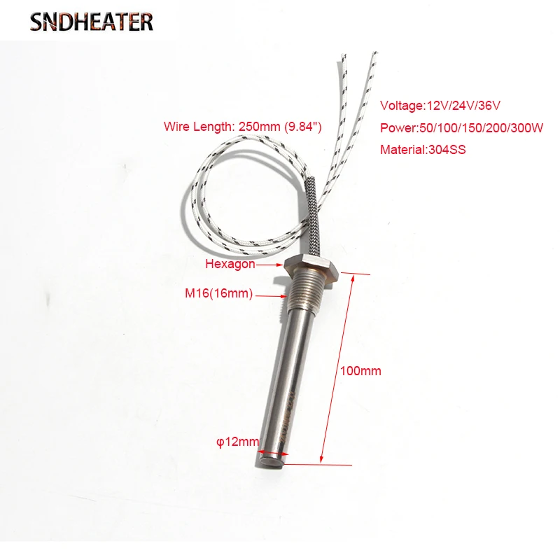 SNDHEATER 12V 24V 36V M16 Thread Cartridge Heating Element with Nut 12x100MM 50W/100W/200W Low Voltage Heater Rod for Water Tank
