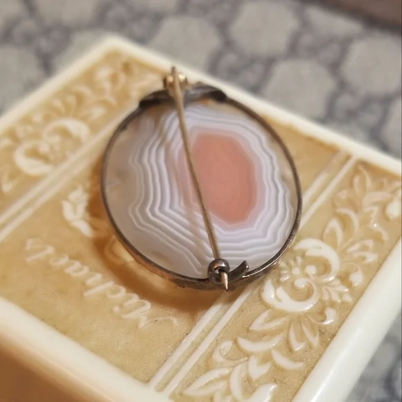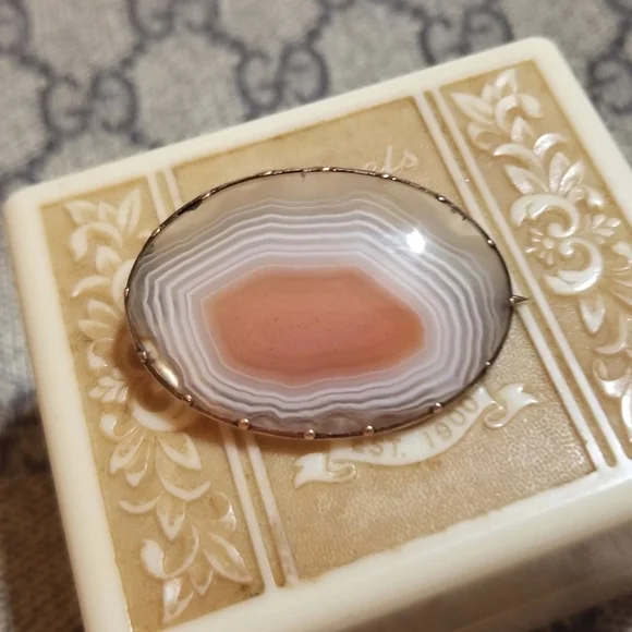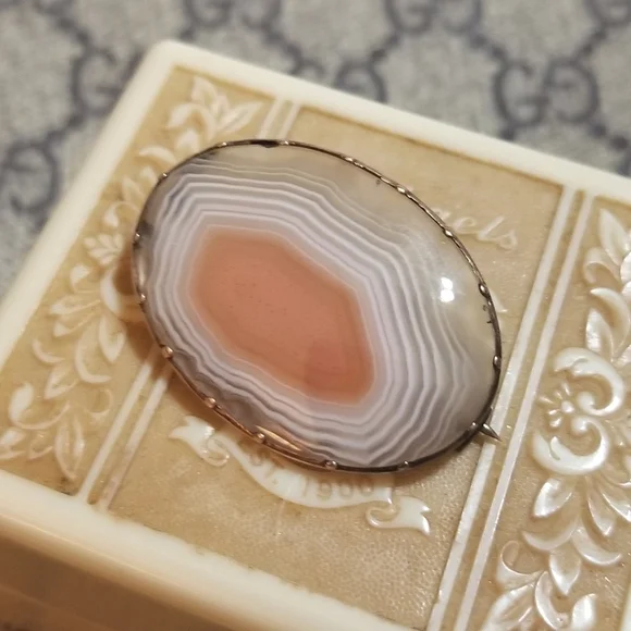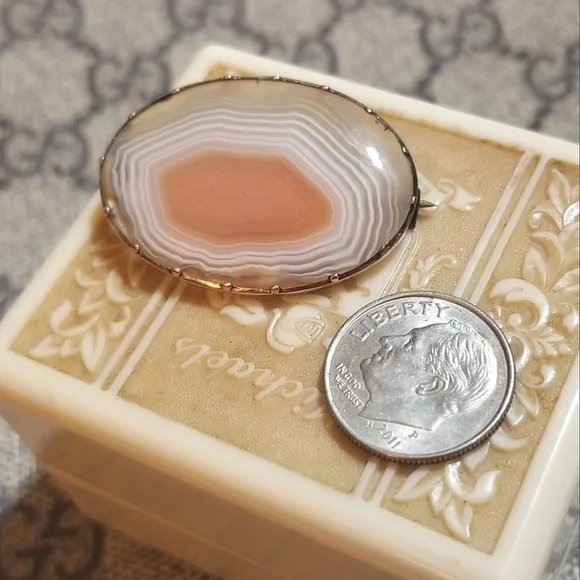 Beautiful Antique Mid 1800s Early Victorian Solid 10kt Rose Gold Banded Agate Brooch. Unmarked, however gold tested and guaranteed to be solid 10kt Rose gold. Most pieces this Early that are handcrafted, as this one, weren't marked. The Condition is Excellent and far better than ever expected for a piece that's 170+ years old. The Beautiful Natural Banded Agate has coral orange, white, cream and sheer areas. Someone took great care in crafting an Exquisite Work of Art, that has stood the test of Time. Measures 1.25" x 1" and weighs 4.77 grams. This would be beautiful on a blouse, lapel, hat, scarf or could even be worn by a man on a hat, tie or Kilt ! Item E28.I've been in Vintage/Antique jewelry for over 35yrs and I sell some new items occasionally. Feel free to ask questions.MY LISTINGS GENERALLY CONSIST OF MANY ONE OF A KIND OR VERY RARE PIECES, SOLID 14KT ITEMS, PLATINUM, 18KT, DIAMONDS, AMETHYSTS, TOPAZ, AGATE, EMERALDS, SAPPHIRES, OPALS, STERLING SILVER, VINTAGE AND ANTIQUE PIECES, BOLD AND RUNWAY-ERA. DESIGNERS SUCH AS GIVENCHY PARIS NEW YORK, CHRISTIAN DIOR FRANCE, FENDI ITALY, VALENTINO, KENNETH JAY LANE, CHANEL, ALEXIS BITTAR, YVES SAINT LAURENT, HENRI BENDEL, HERMES, JUDITH JACK, KATE SPADE, MICHAEL KORS, MIRIAM HASKELL, CORO, PRADA, GUCCI.