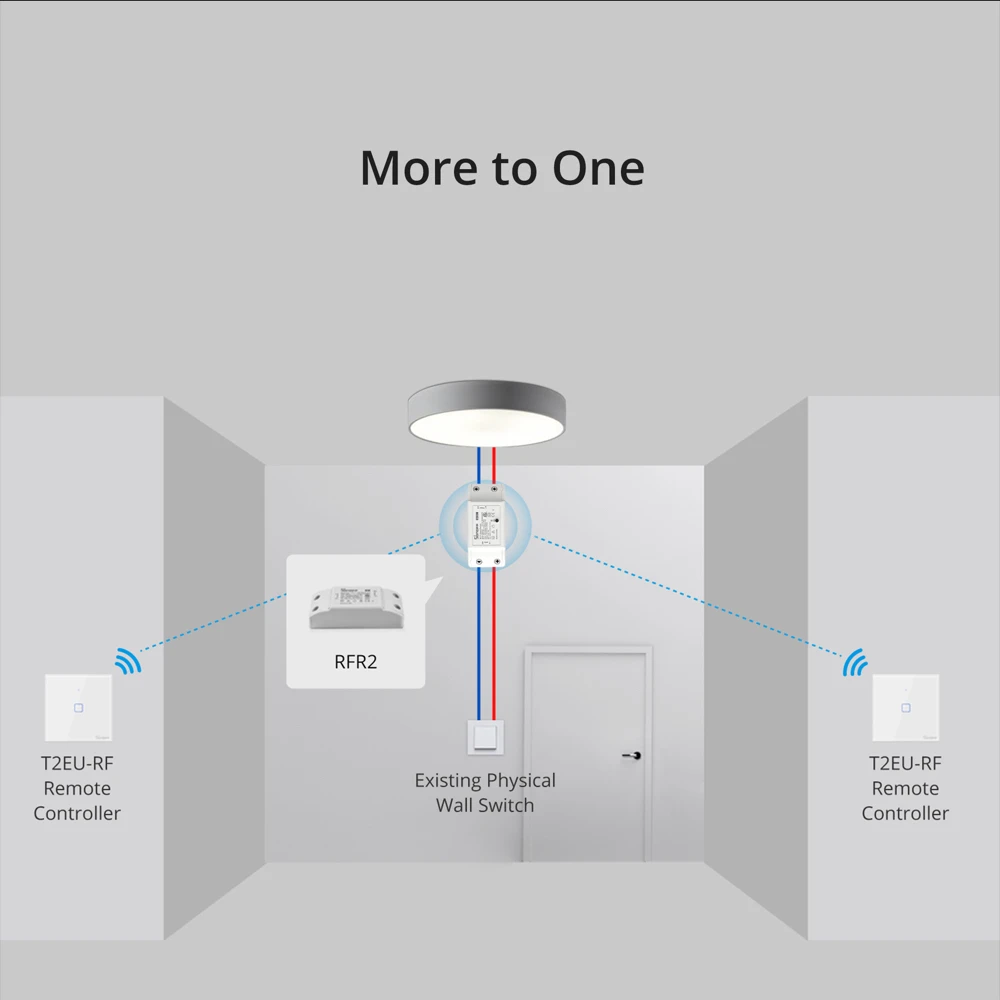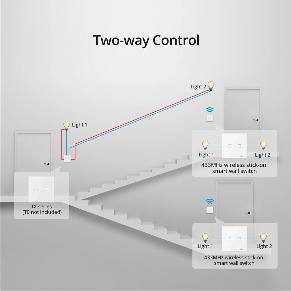 Give you one more option on the control of the light. As a 433MHz RF switch, it can match the SONOFF TX wall switches that allows you to control the light from two different positions without need of wiring.