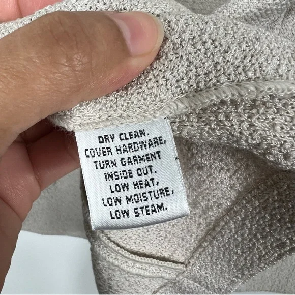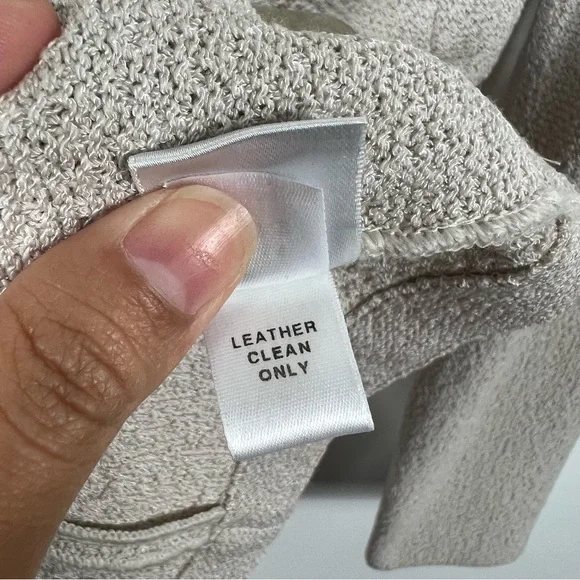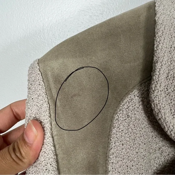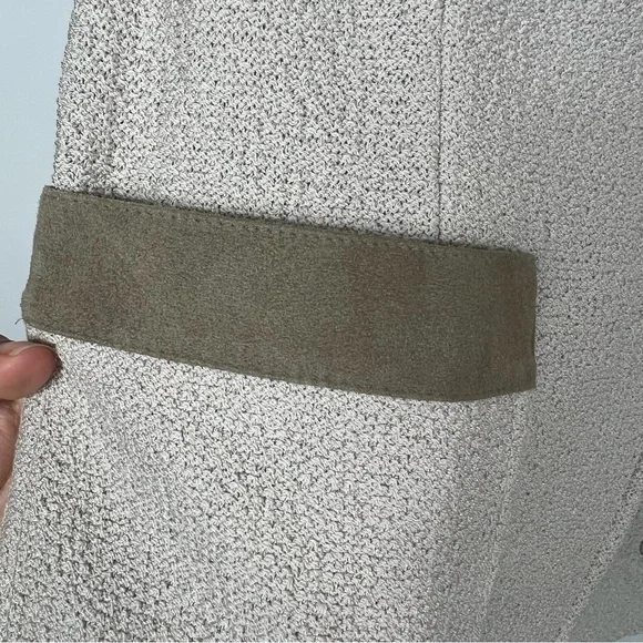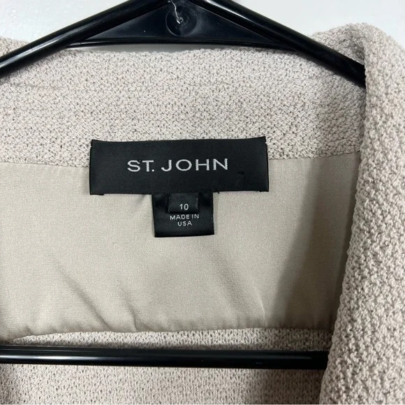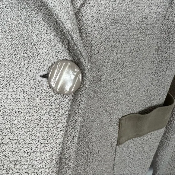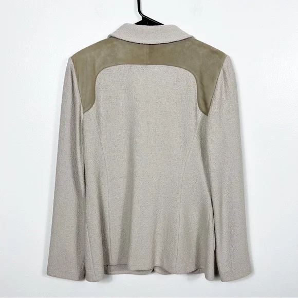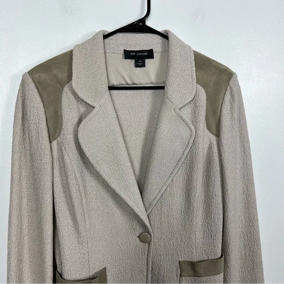 St. John boucle knit suede trim single button beige jacket size 10Suede trim at the pocket and shoulders - (small stain at the right shoulder, see last photo) single button closure.