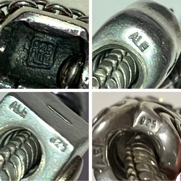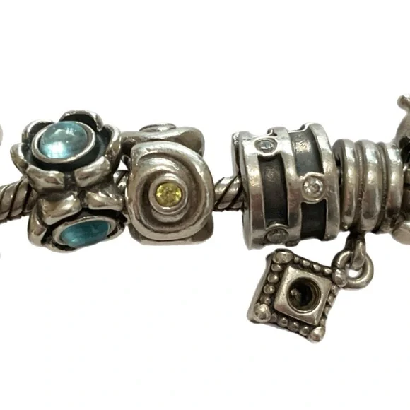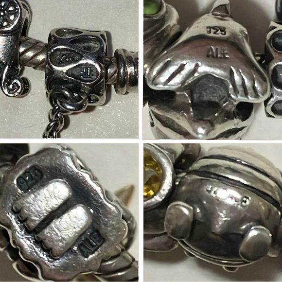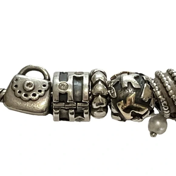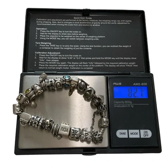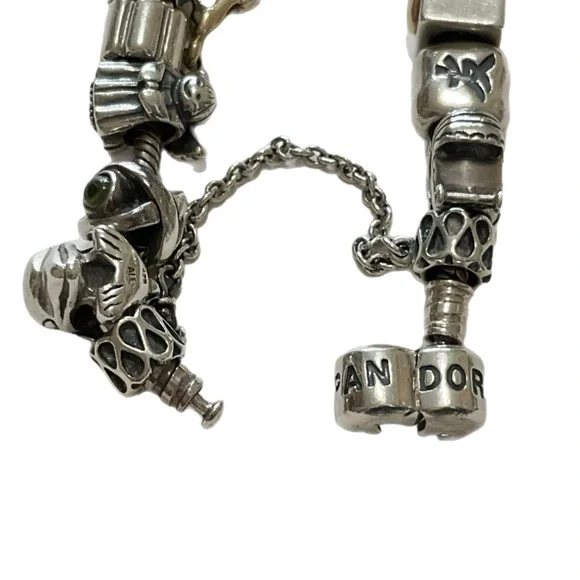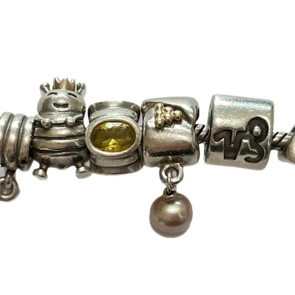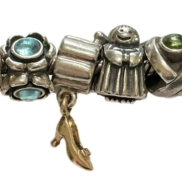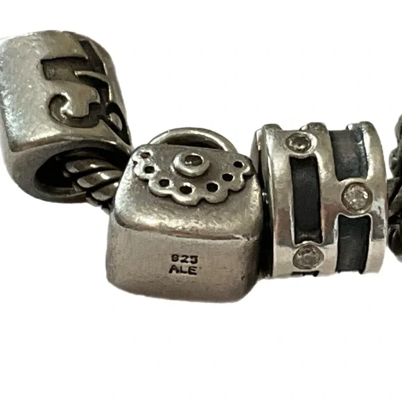 Sterling Pandora 20 Charm Bracelet - ALE 925Fabulous Pandora bracelet totally filled with genuine Pandora charms. I have found the ALE 925 mark on all but three, but probably just can’t see it on those with my eyesight.Among the charms are a baby buggy, angel, queen bee, a high heeled shoe, dolphin, Capricorn, and jeweled bands. About 7” long, 82.7 grams. Good condition. J-1817-TC-8o