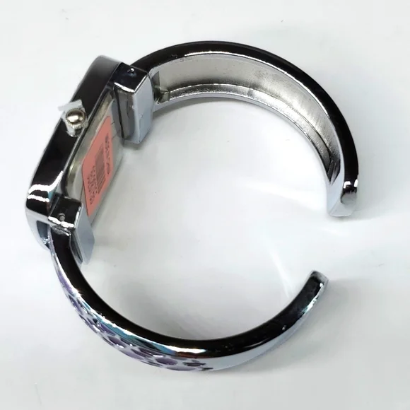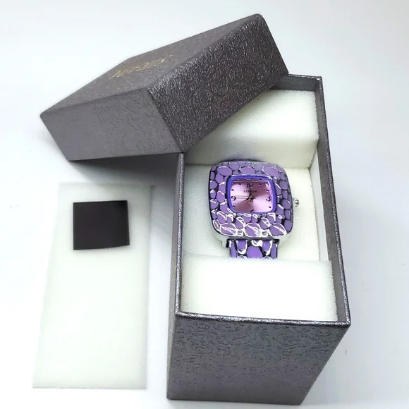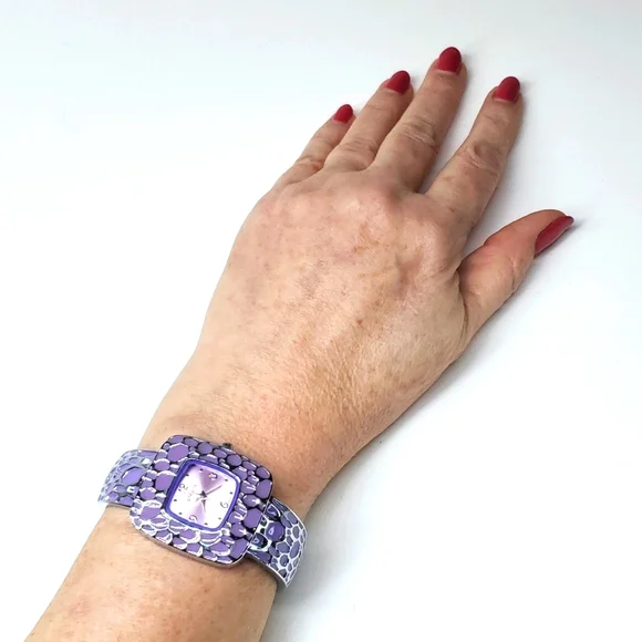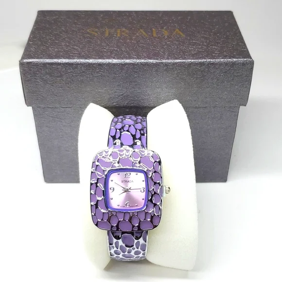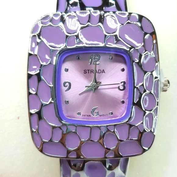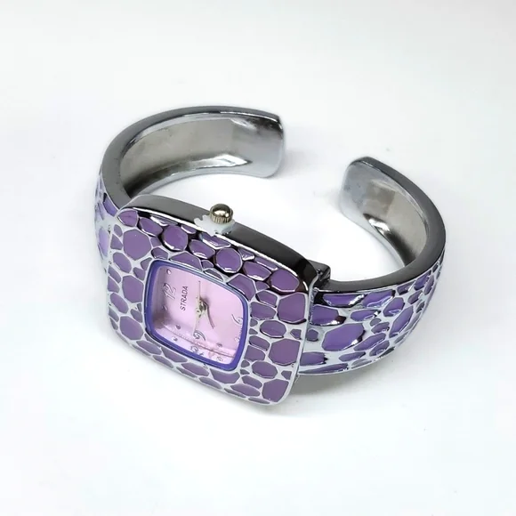 Strada Purple Enameled Japanese Movement Open Bangle Watch Stainless Steel Caseback NWTBrand:Strada Style:Black Enameled Japanese Movement Open Bangle Watch Stainless Steel Caseback Features:*Purple (Lavender colored) Enameled watch*Premium quality metal in silvertone*Lavender (purple) face*Silver toned numbers: 12, 3, 6 and 9 are displayed.Remaining numbers are indicated by a silvertone dot mark.*Sapphire Glass is scratch resistant *Leopard looking design*Japanese Movement ensuring accuracy *Open Bangle or Cuff style bracelet.It opens to slide on wrist.*Stainless Steel Caseback *Water Resistant *3 hand watch including second hand*Includes it's own box packed in foam.To use:Remove plastic tab from knob and press inward to activate battery. Colors:Purple, silverApprox.Size:6.5" Condition:NWT.New with tags.Excellent.*At the time of this listing, battery is new and working, see video.New to ?Sign up for a new account using my code DONNACORLESS & receive $10 towards your 1st purchase.