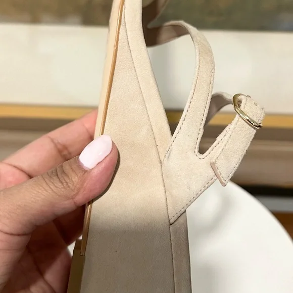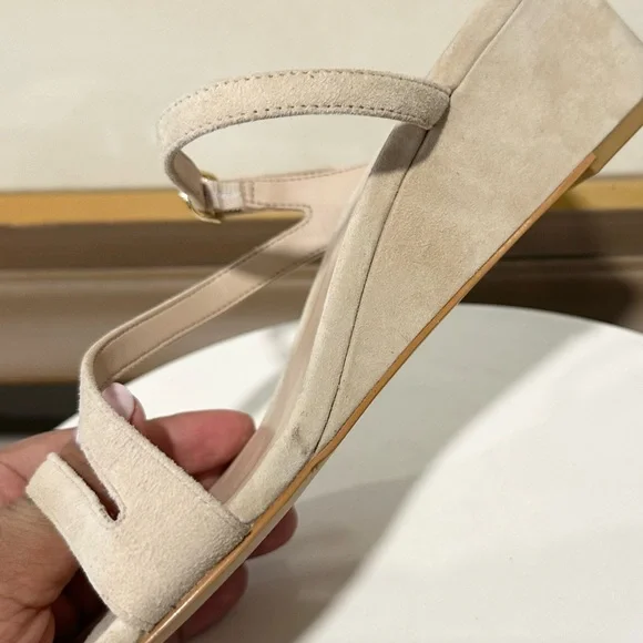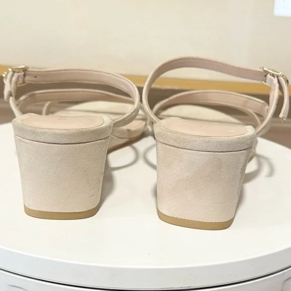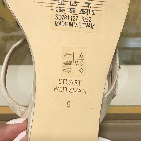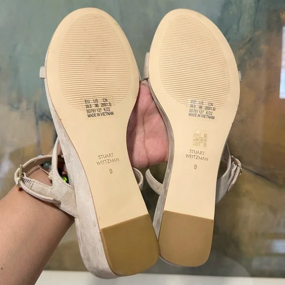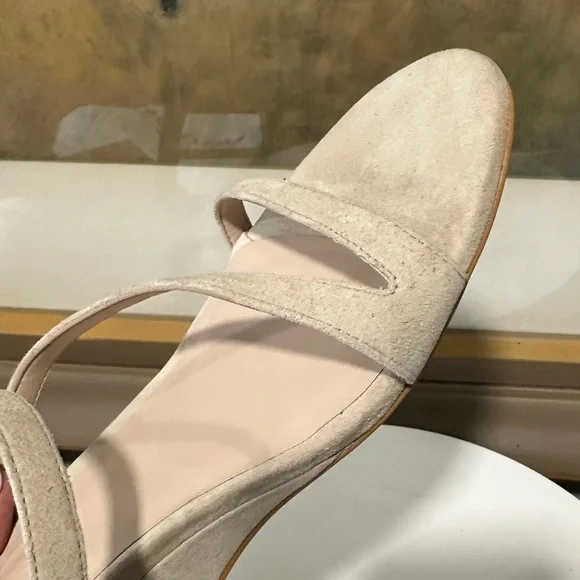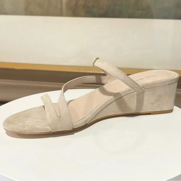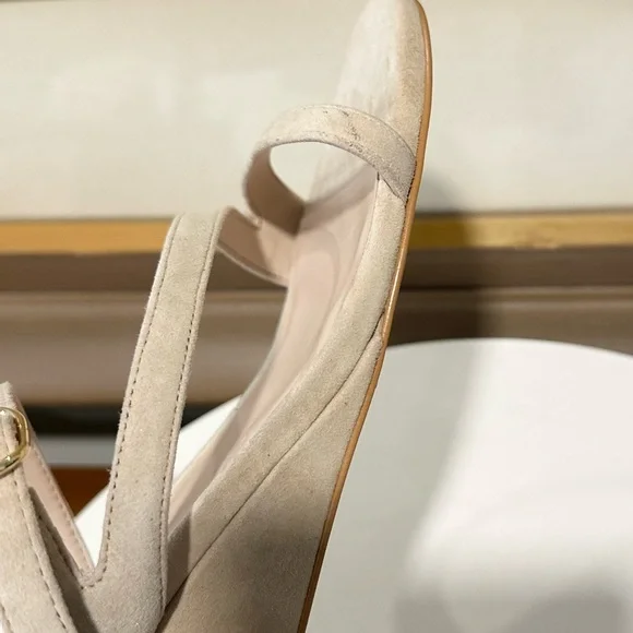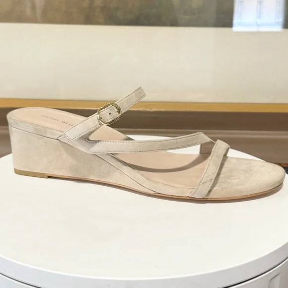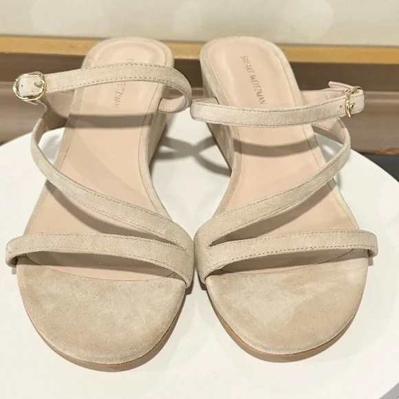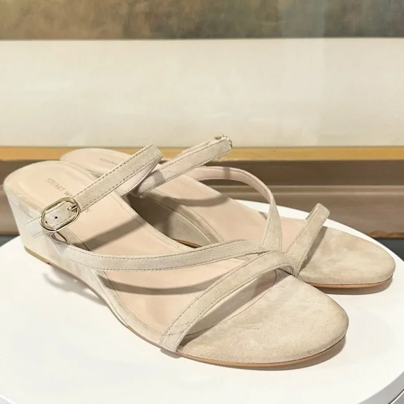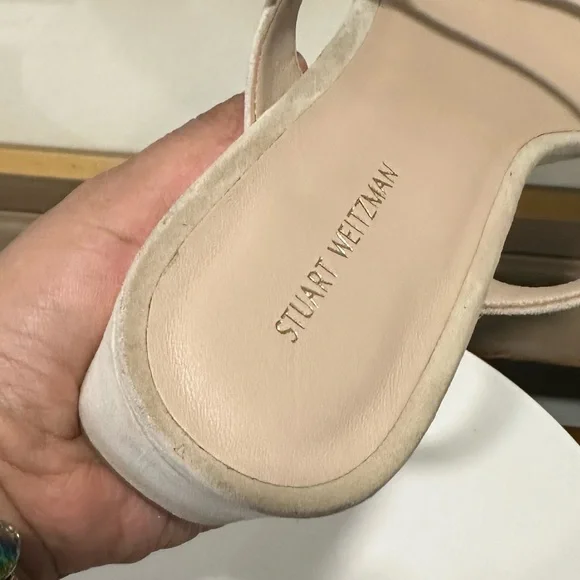 STUART WEITZMAN SandalIntroducing the Stuart Weitzman Align II Suede Sandal, a stunning addition to any woman's shoe closet. Made with beige suede and boasting stylish gold-tone hardware, this sandal is the perfect combination of artistry and function. The adjustable ankle strap with buckle closure ensures a secure fit, while the lightly padded leather insole provides additional comfortNew without tags or box Although these are new, stains are present, scuffs, fading, creasing, or scratches may be present due to previous store display and try onsotherwise in excellent condition. Sticker residue on bottom sole. Please refer to all pictures for more details and information🦋OFFERS ARE WELCOME🦋 Reasonable offers ACCEPTED