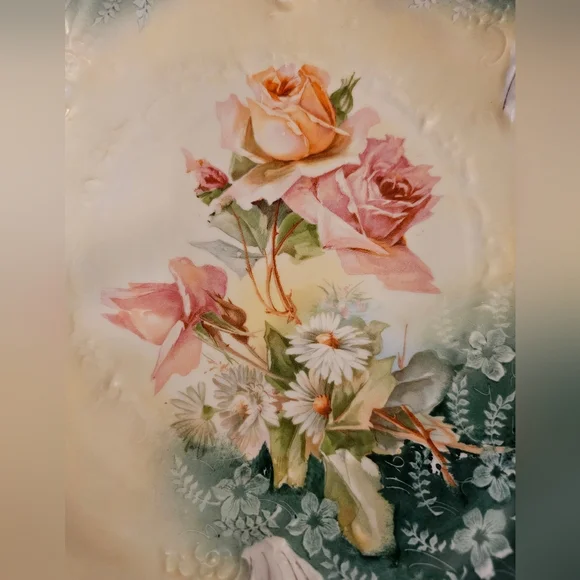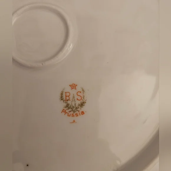 Stunning condition!! Antique R.S. Prussia porcelain bowl, likely a master berry bowl, featuring a hand-painted floral design with roses and daisies. The bowl is characterized by its scalloped edge, molded details, and gold accents. Here are some details about R.S. Prussia porcelain:Origin:R.S. Prussia porcelain was produced by Reinhold Schlegelmilch in Suhl, Germany, from 1869 to 1956. Design:The porcelain is known for its intricate hand-painted floral designs, often featuring roses, as seen in the image. This bowl is a beautiful example of antique German porcelain, showcasing the craftsmanship and artistry of the R.S. Prussia era. Size 11"Circa 1890's - 1920's
