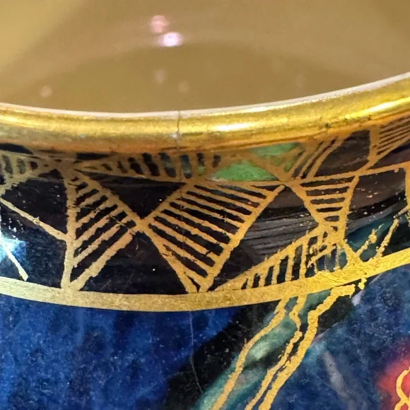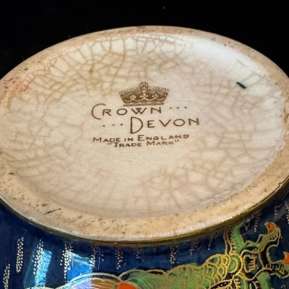 This exquisite Art Deco hand painted lustre vase features a green, orange and gold dragon surrounded by vibrant blue, green, purple, and gold flowers, along with an Asian temple. The bottom is crazed from age, and there is one small age line on the rim (See last two enlarged photos). The vase is marked on bottom CROWN DEVON MADE IN ENGLAND “TRADE MARK” with the pottery’s crown logo.