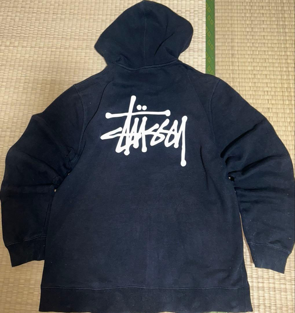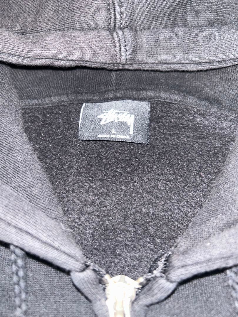 Black Stussy zip-up hoodie, size L, with a large logo on the back.