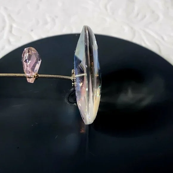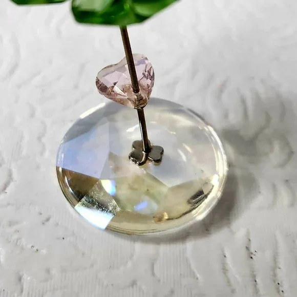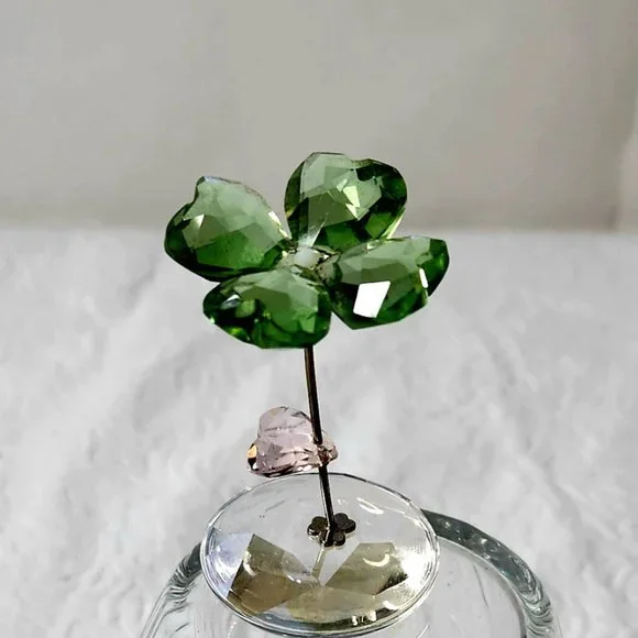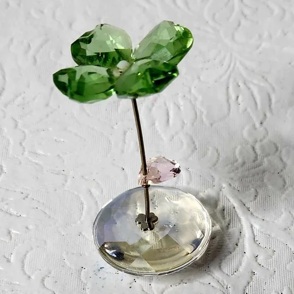 Swarovski "Liv" Four Leaf Clover with Heart FigurineLiv stands for luck as it has been modeled after a 4 leaf cloverIts petals are created in faceted Peridot CrystalIts center is a small White Alabaster crystal chatonA heart shaped leaf in faceted Rosaline Crystal (pink)Comes on the silvertone metal stem attached to rocker with a metal 3 leaf cloverSpecial detail:the faceted spherical base in moonlight crystal enables rocking movement!3cm x 5.6cmExcellent used condition