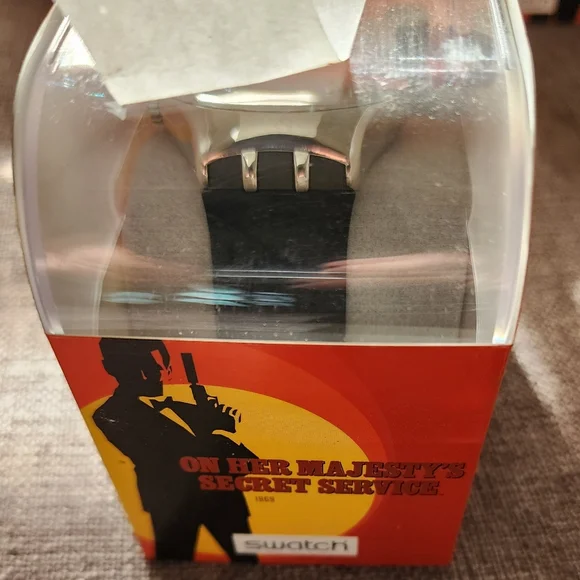 Swatch Irony Watch ON HER MAJESTY'S SECRET SERVICE YNS402 ~James BOND 007 - NIB Never WornWatch pictures limited as did not remove from plastic case to avoid damaging anything. New in package with papers. Cover shot is a stock photo for reference.This Swatch is part of a family members watch collection that has been in storage since purchase. Might need a new battery since watch never worn.