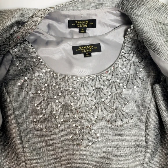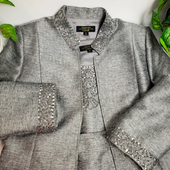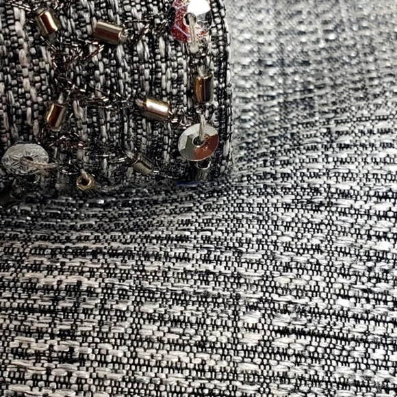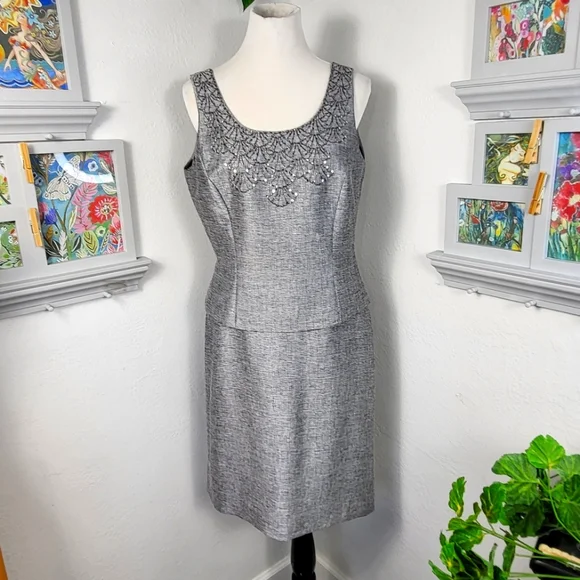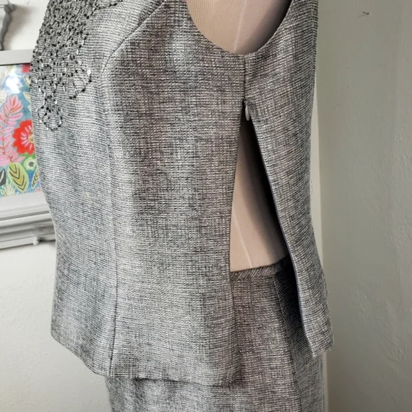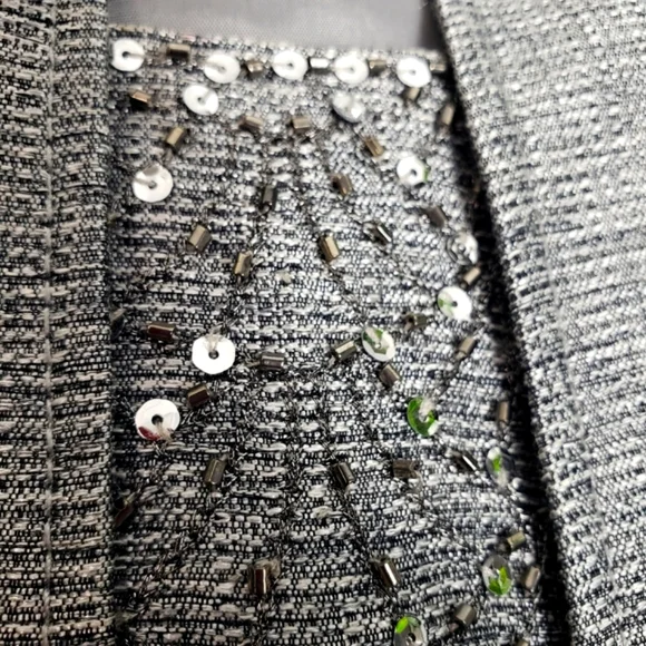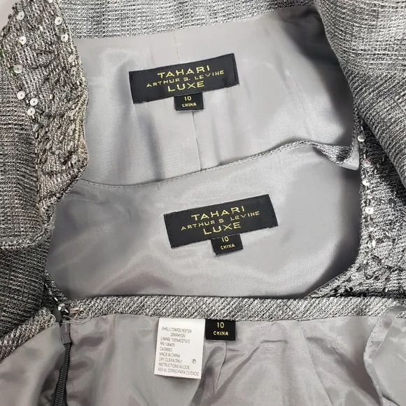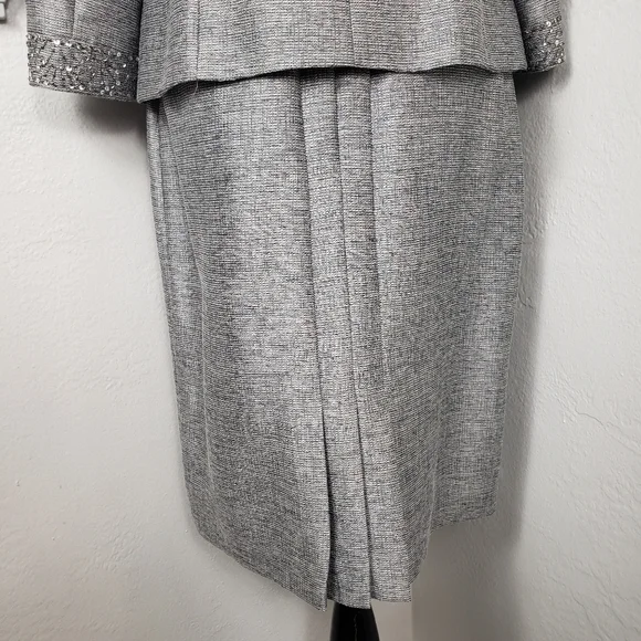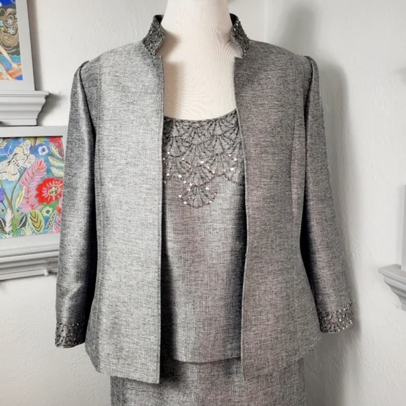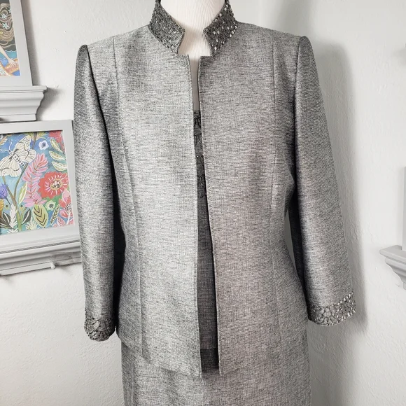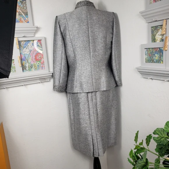 💋NEW without tags condition.Looks like it was never worn, or worn gently with no signs of wear.This Classic 3 piece Suit will make the perfect addition to your Capsule Wardrobe Collection. Its style and color makes it a Staple..and a "Go to" for so many occasions. Suggestions... Wedding - Anniversary - or any Formal or Semi-Formal function. Gray (Grey) Tweed Boucle Fabricall 3 pieces are Fully Lined, but Lightweightthe BLAZER... sz 10Open Mandarin CollarBeads and Sequins adorn the Collar and CuffsPadded Shoulders3 Hook & Eye Closure20 in.across Pit to Pit or 38 in. all the way around at Bust18 in. across or 36 in. all the way around at Waist20 in. across or 40 in. all the way around at Hemline23 in. Longthe SLEEVELESS TOP size 10Side Zip opening for easy put-onScoop NecklineBeads and Sequins adorn the front20 inches Pit to Pit or 40 in. all the way around at Bust17 in. across or 34 in. all the way around at Waist19 in. across or 38 in. all the way around at the Hemline21 in. Longthe SKIRT sz 10Classic Cut with 3 Vents at BackBack Zip Closure15 in. across or 30 in. all the way around20 in. across or 40 in. across all the way around23 inches LongAll Measurements above are approximate Please ask any and all questions you may have before purchasing❣🤗 NOTE..all purchases made via "Make an Offer" transactions will not be canceled perPolicies. All "Reasonable" offers are Welcome!Don't forget to Bundle & Save on Shipping Charges!