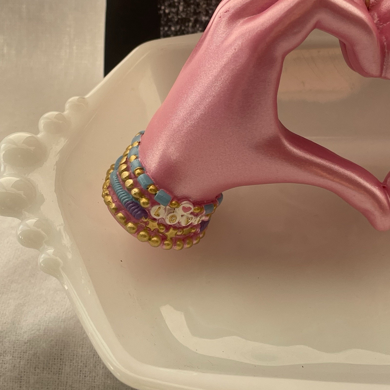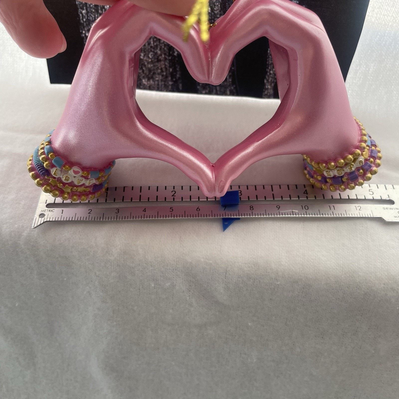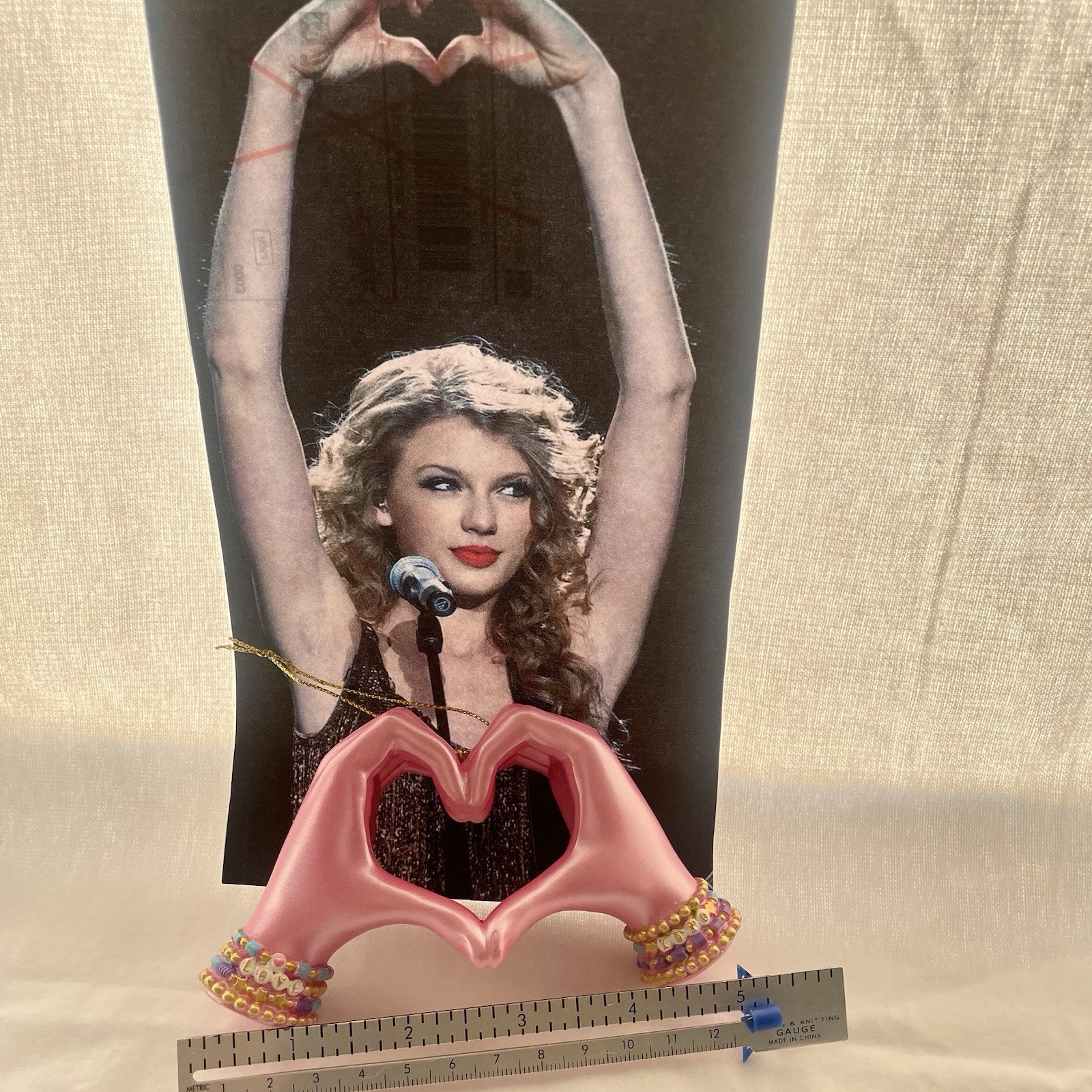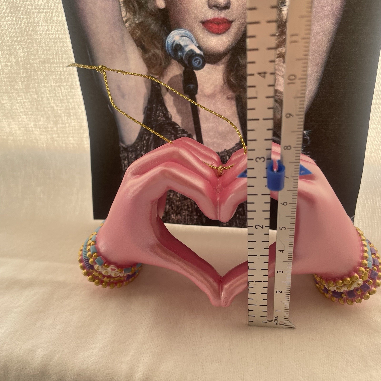 The Taylor Swift Christmas Ornament is a unique and charming collectible that features a pink hand heart-shaped design with friendship bracelets on both wrist. perfect for celebrating the holiday season with a touch of Taylor Swift-themed flair. Made of resin and embellished with intricate details, this ornament is a perfect addition for fans of musical bands and groups. The friendship-themed ornament sets the tone for a festive and fun Christmas celebration, making it a special addition to any ornament collection. Measurements in photo.
