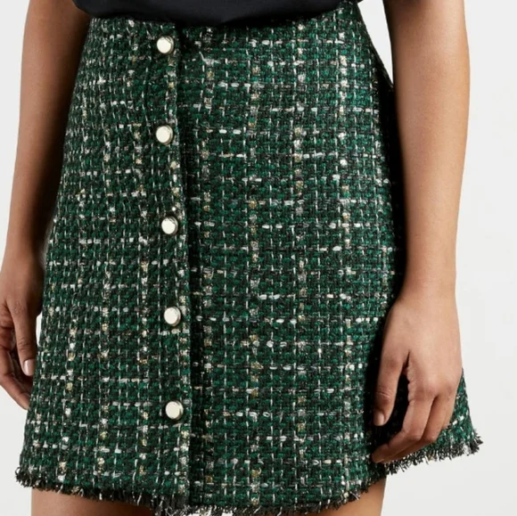 NWT Ted Baker boucle mini skirt with button embellishment closure in beautiful green and mettalic woven design perfect for the holidays. Ted Baker size 4 ( US 8-10). approx 26" top to bottomfrayed hem for playful design. make it yours for your stunning holiday party look shipsASAPoriginal retail $245