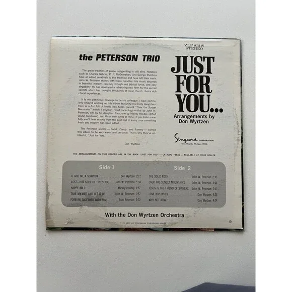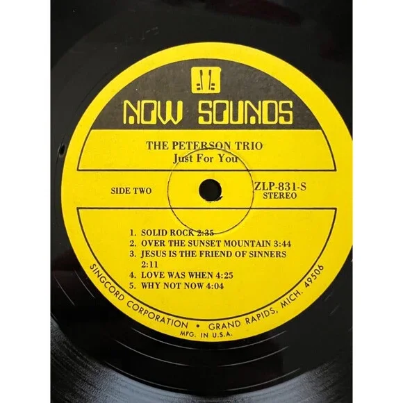 The Peterson Trio with the Don Wyrtzen Orchestra's 1971 LP "Just Like You..." on Now Sounds ZLP 831Outer jacket has no writing, markings, cut corners, seam splits, tears or punch holes. Spine intact. Record has been cleaned and appears a strong VG+ under direct sunlight with few light superficial markings visible. Record spot plays clean and clearRecords are graded on visual inspection. Any questionable areas are spot play tested and commented on above. They have not been played all the way through. We do our best to make an honest grading of the record, however unseen sound issues may be present as is the case for any used record purchased anywhere else.Records have been cleaned with Spin Wash Record Cleaner prior to shipment for the best possible audio quality upon arrival.