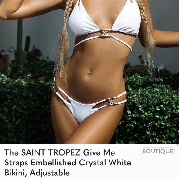 The SAINT TROPEZ strapy bikini is a sexy suit designed to give of the chic vibes with it’s sleek embellishments, adjustable bottoms, this suit is directly inspired by the summer ocean vibes. This sexy and elegant bikini has the perfect balance to enhance your curves and enough bling to allow you to shine VIP style, beach or pool side.•Adjustable •Available 80% nylon, 20% spandexMade in IndonesiaHand washOne shoulder stylingFront cut-out design with gold-tone ring accents