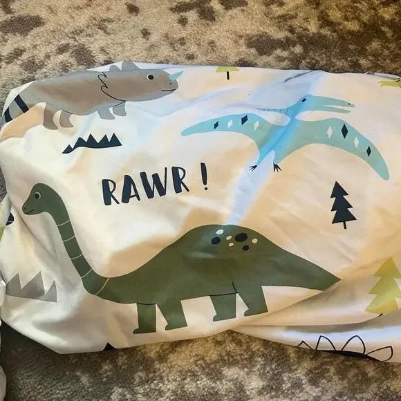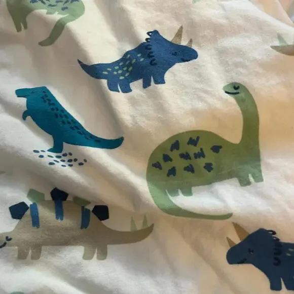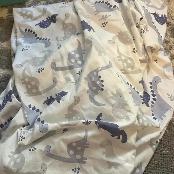This listing is for three dinosaur themed crib sheets. The first one is white with a pattern of blue and gray dinosaurs. It measures 52"x28". It is made by Lambs & Ivy. The second one white with a green, blue and brown dinosaur pattern. It measures 58"x28". It is made by Cloud Nine. And the third one is white with a green navy, and grey dinosaur pattern. It measures 52"x28. It is made by Sweet JoJo Designs. All three of these sheets are 100% cotton. They are preowned in very good condition. They come from a non-smoking home.“** I will consider reasonable offers. But I will not accept offers for 50% off