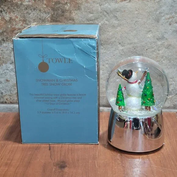 Towle Snowman Christmas Tree Snow Globe Music Box Plays 12 Days of Christmas Holiday DecorMeasurements: Snow Globe Music Box: 4 x 4 x 6 inWeight:1 lb 9 ozBox Measurements: 5.5 x 5 x 7 inBox Weight: 1 lb 12.2 ozYour item may come in a re-used box with some labeling from other companies In my effort to recycle and re-use. Thank you for supporting my small business.Features:• Snow Globe Music Box• ChinaCondition: Pre-Owned Like NewWear in box.