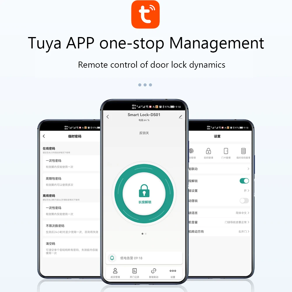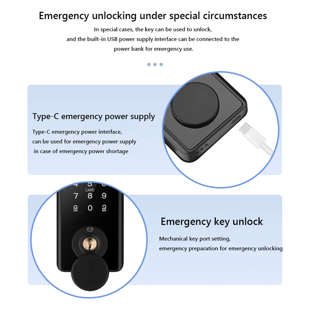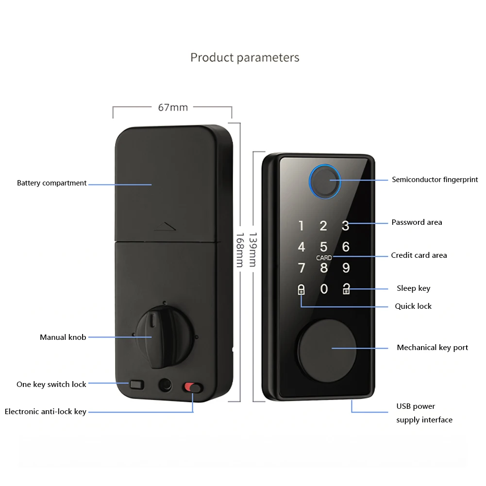 Feature: 1. Multiple unlocking methods: Including Tuya APP/100 sets of passwords/100 sets of fingerprints/2 X IC cards/2 X keys, no longer worry about losing or forgetting keys, you can choose and unlock your door in the way you like. 2. Smart Graffiti APP: Easily realize the intelligent life of home interconnection. Real-time management, door opening records, viewing door lock status (unlocking records, abnormal alarms, remote unlocking, etc.) (optional). 3. Large-capacity design/quick unlocking: The fingerprint capacity is large, which can store 100 fingerprints and 100 sets of passwords. Convenient to store fingerprints and passwords of family members or close friends. Ergonomic design, semiconductor fingerprint head, allows you to unlock quickly, just put your fingerprint on the door, it will automatically lock for you, accurate identification. 4. Emergency unlocking/anti-peeping design/indoor anti-lock key: When the battery is seriously low or the battery is completely exhausted, don't worry, you can use the spare key to open the door, or you can use the USB Type-C charging port that comes with the product to connect to the power bank Temporary power supply use. The fake password anti-peeping design can enter garbled characters before and after the correct password. It will effectively protect the personal safety of you and your family. Push the lock button to electronically lock or unlock the lock. After the lock is unlocked, the first three groups of administrators can unlock the lock normally, but ordinary users cannot. 5. Simple installation: Comes with screw fittings and comes with detailed manual and installation video, it can be easily installed in minutes without a locksmith. Specification: Certification: CE Origin: Mainland China Smart home platform: Tuya Model Number: Smart Door Lock Ways To Unlock: Fingerprint,Card,Password,APP,Mechanical Keys Doorknob Funcition: Biometric,Key & Keypad Finish Type: Polished Special Features: Support Gateway Suitable Door Type: Wooden Door Protection Level: No Waterproof Power Supply: Dry Battery Product color: Black Product material: Aluminum alloy Product options: A Fingerprint + password + IC card + key, B Tuya APP + password + IC card + key, C Tuya APP + fingerprint + password + IC card + key (optional) Fingerprint collector: Semiconductor fingerprint head Unlocking method: Fingerprint / password / key / Tuya APP User capacity: Fingerprint/password/card (100 groups each) Number of administrators: 3 Optional function: Wired door sensor / Tuya APP Dynamic current: ≤60UA Quiescent current: >250mA Emergency power supply: USB Type-C interface Power supply: 6V (please choose alkaline 1.5V battery) Low voltage alarm: 4.7V±0.2V Relative humidity: 20%-90% Operating temperature: -25°C - 70°C Adapt to door thickness: 30-65cm/11.81-25.59in Applicable scene: Indoor wooden door/office door/entrance door/apartment hotel door Product size: 168x67mm/6.61x2.64in Product weight: 900g Note: Due to the different monitor and light effect, the actual color of the item might be slightly different from the color showed on the pictures. Thank you! Please allow 1-2cm measuring deviation due to manual measurement. ![]() 1 X Smart Door Lock Body