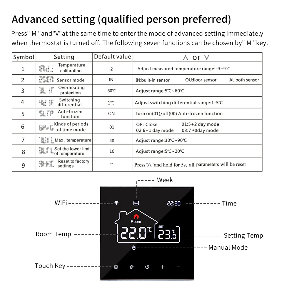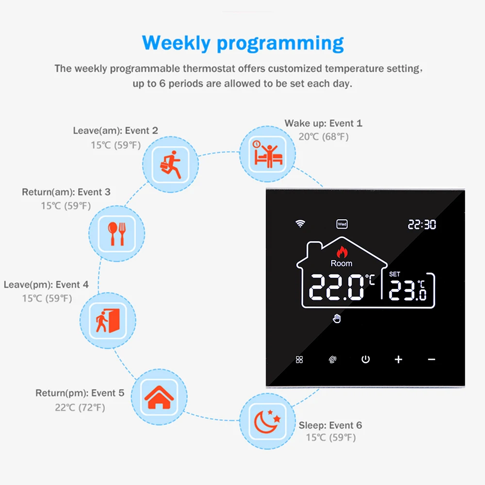 The thermostat supports different temperature setting accordingly with 6 time-modes daily.7 Days programmable