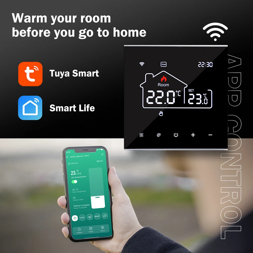 Using your smartphone or tablet remotely control the smart wifi thermostat by free app Smart Life or TuyaSmart from anywhere at anytime.