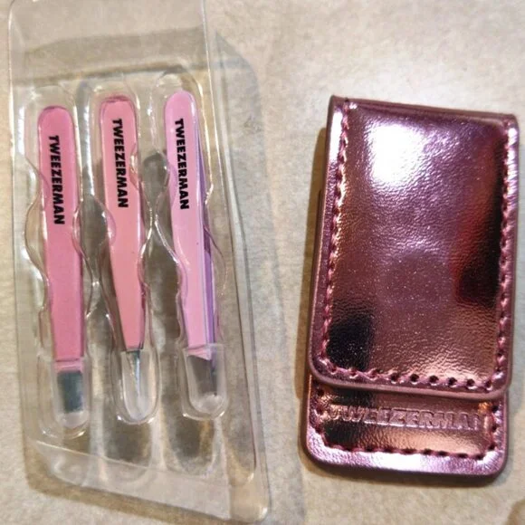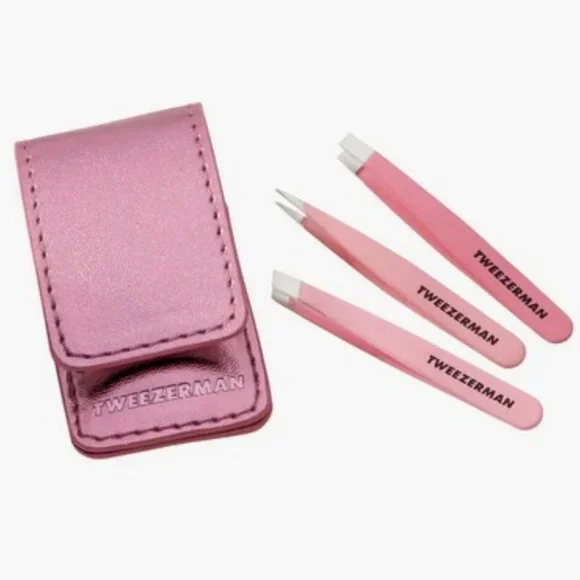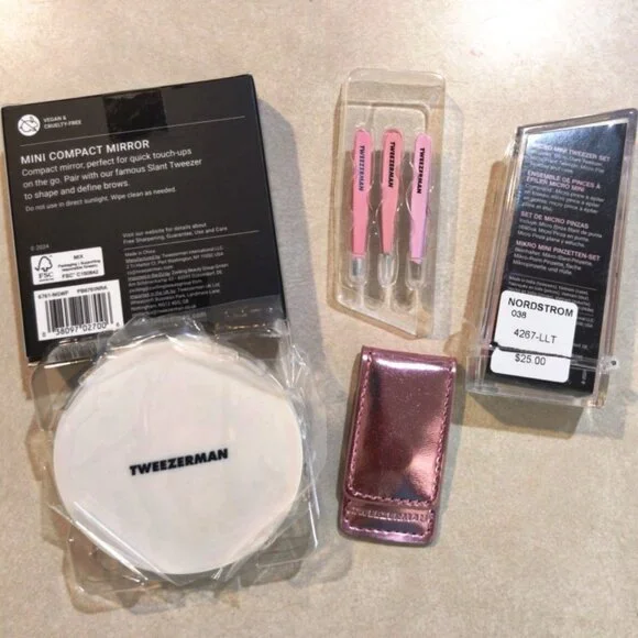 NEW Tweezerman Micro Mini Tweezer Set of 3 w/Pouch and Compact Mirror, Total Retail $40.A set of three mini tweezers made from high-quality stainless steel to grab every hair, every time.The set includes:- Mini Slant Tweezer: a tweezer for plucking visible brow hairs under and above your desired brow shape.- Mini Flat Tip Tweezer: a tweezer for removing thicker hairs.- Mini Point Tweezer: a tweezer for removing fine or ingrown hairs.- Pink Metallic Travel Case-Ships with Compact Travel Mirror.