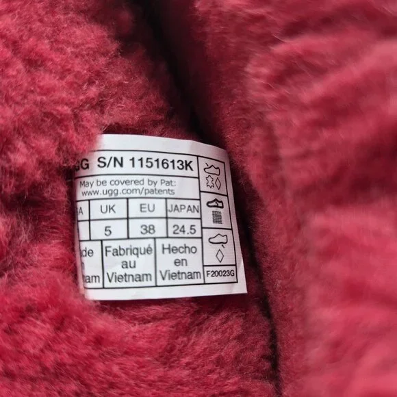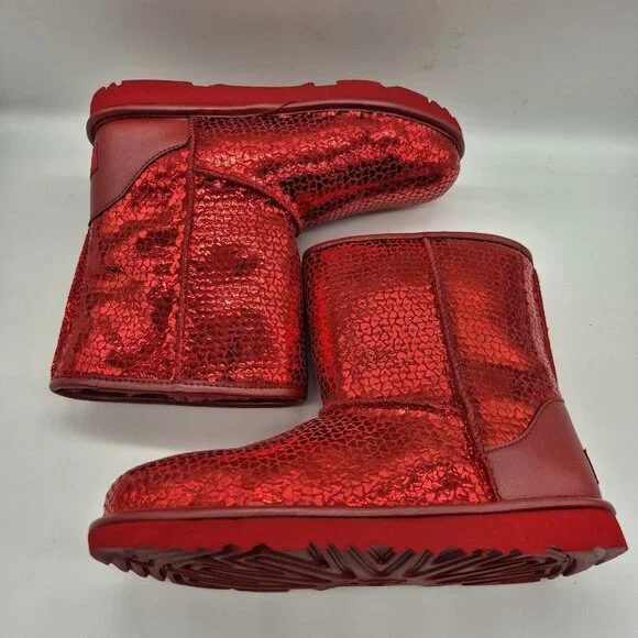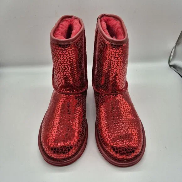 These UGG Classic Short boots are the perfect addition to any teen's casual shoe collection. The red metallic pattern with heart accents adds a fun touch to any outfit, and the faux leather lining and insole provide comfort and durability. The round toe and pull-on closure make them easy to wear, while the 1 inch platform height and low flat heel provide support and stability. These boots are ideal for winter and fall seasons and are available in UGG Youth Size 6.