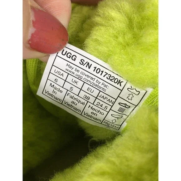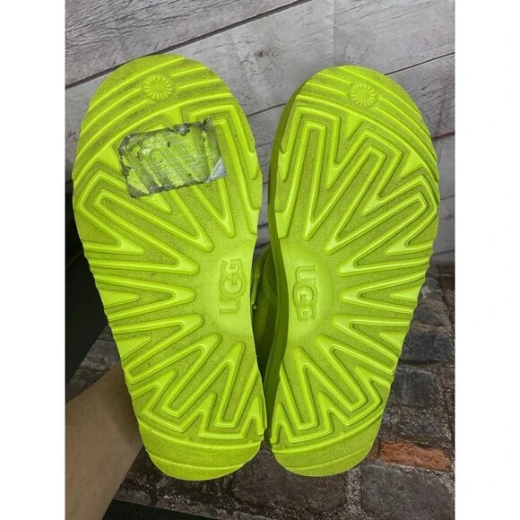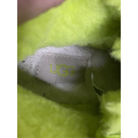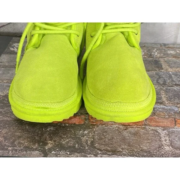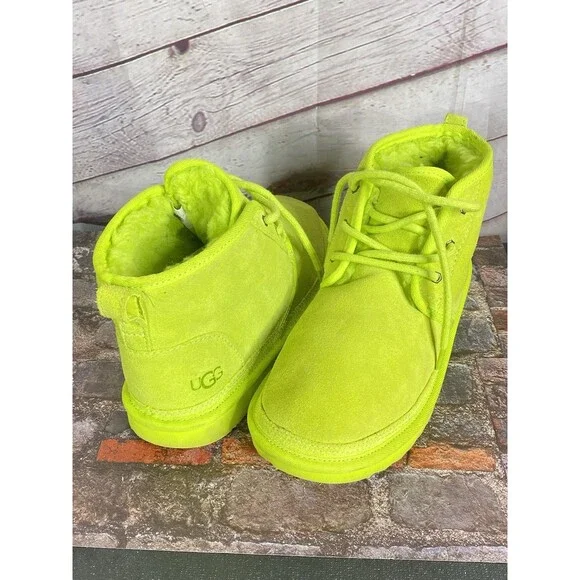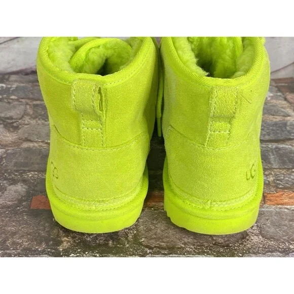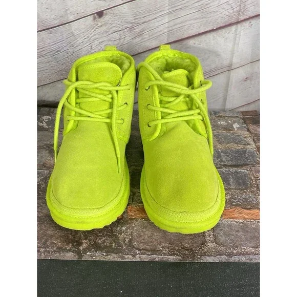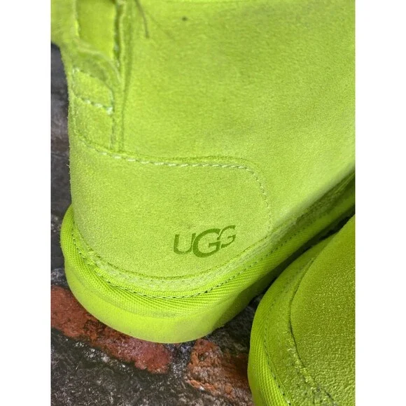 The UGG Neumel II Chukka Boot in key lime is a stylish and versatile option for big kids and women. Made with suede and featuring a cozy shearling lining, these boots are perfect for casual and travel occasions. The lace-up closure and flat heel make them easy to wear for everyday activities like walking and school. With a mid-top shaft style and rubber outsole, these boots provide both comfort and durability. The UGG logo accents add a touch of branding to these solid color boots, which are suitable for all seasons.Size 6 BIG KID or 7 Women's USA 38 EUROGreat ConditionNo FlawNo HoleNo StainPet/Smoke Free HomePerfect for Back to SchoolHeel Height: 7/8"Light Signs of WearPlease LOOK at ALL the PHOTOSShaft Height: 4 Inches