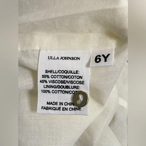 New with tag super cute and adorable Ulla Johnson youth girl dress in the size 6. Pull-over style. Ruffle. Pleated. Button back closure. Dry clean. Colors:*Cream, Black, OrangeMaterial:*55% cotton, 45% viscose*Lined ~ 100% cottonMeasurements:*Pit to Pit ~ 13.5”*Length ~ 30”Thank you for shopping at Charms Kloset, I truly appreciate it. Please let me know if you have any questions!