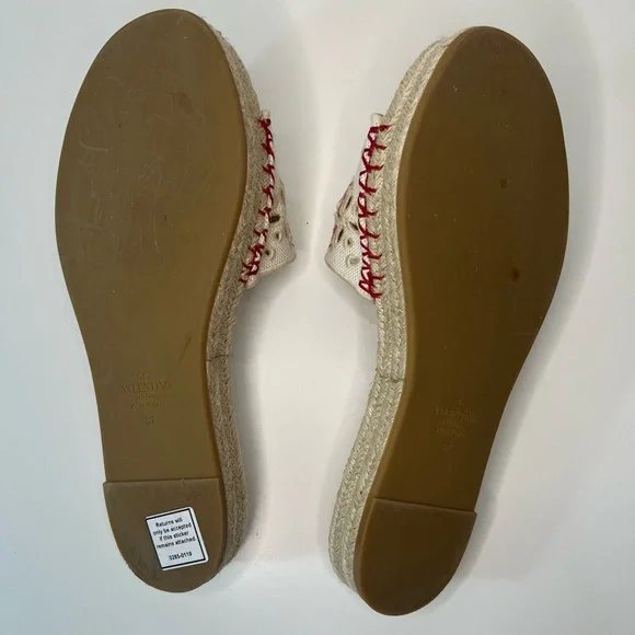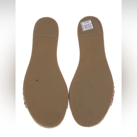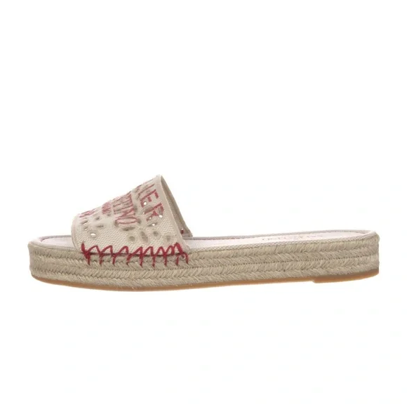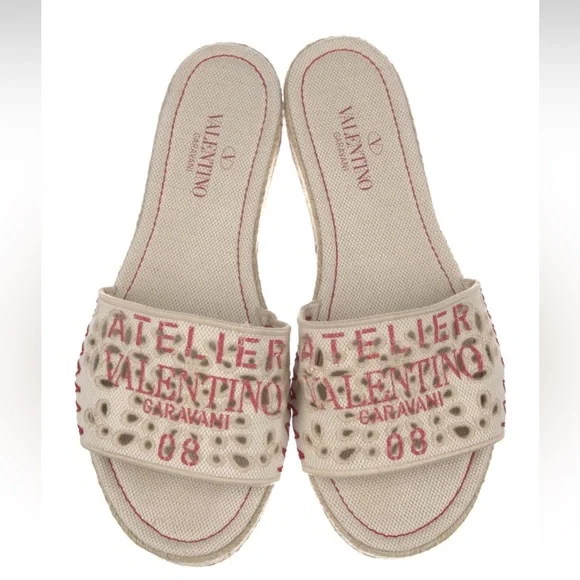 All photos are of the actual item. There are no stock photos in this listing.Description:From the Atelier San Gallo 08 Edition Collection. Updated with logo graphics and lace eyelet details, these sandals are a contemporary interpretation of vintage flair.Details:Fits true to sizeOpen toeBraided jute detail at sole edgeEmbroidered detailing and logo print at toe strapCotton/linen upper and liningRubber soleSlip onMade in ItalyMeasurements:Platform: 1.25"Shoe Size: 7Foreign Size: IT 37