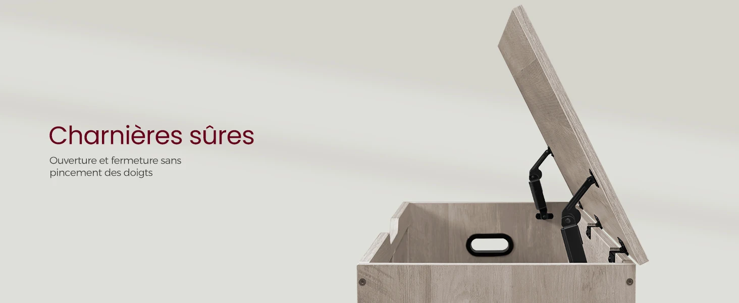 【2 CHARNIÈRE POUR PLUS DE SÉCURITÉ】2 charnières solides permettent au couvercle de ce banc de rangement de rester ouvert en toute sécurité à n’importe quel angle,en évitant de se pincer les doigts