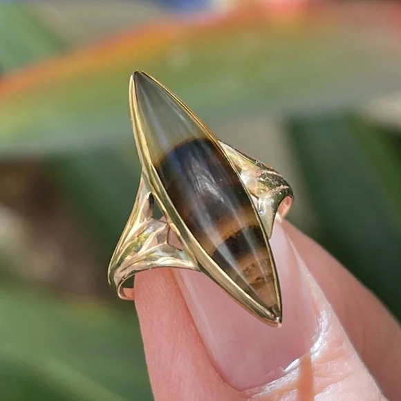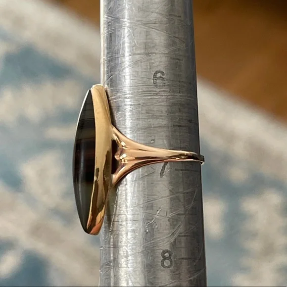 This is an absolutely gorgeous antique Victorian natural genuine banded agate solid 10K rose gold ring. The bands on the agate gemstone are so beautiful and the ring looks amazing on the finger. The gemstone is 25.67 mm long. The ring weighs 2.1 grams and is a size 6.75. In excellent vintage condition.