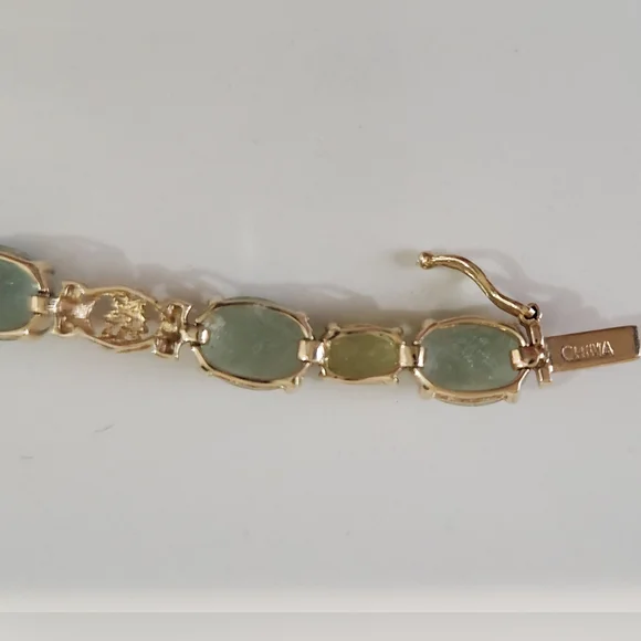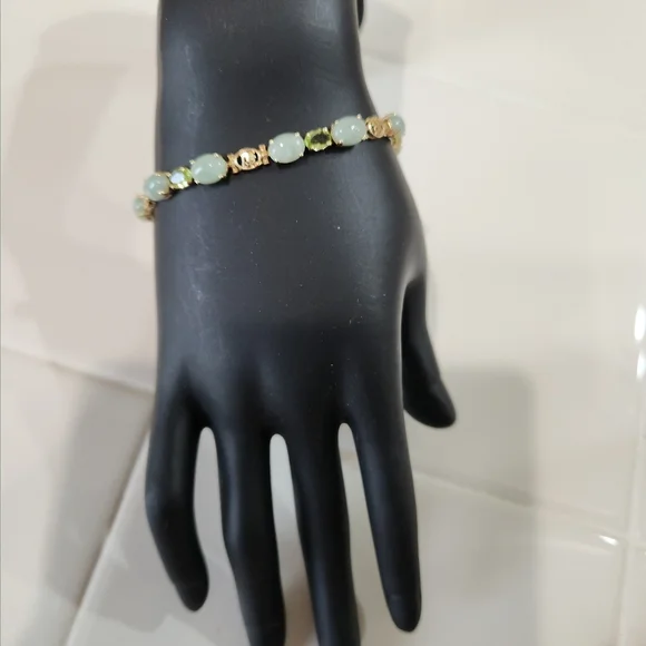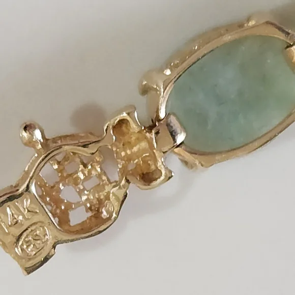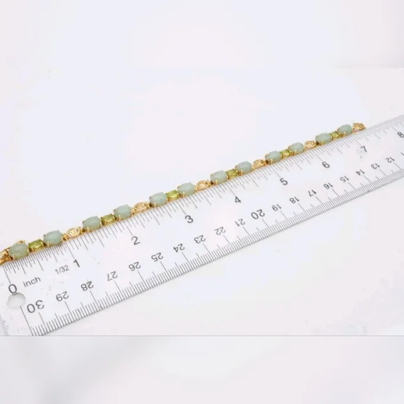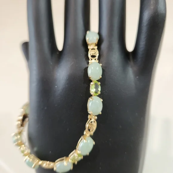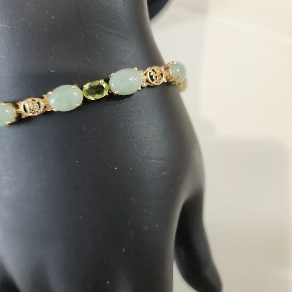 🌸Vintage 14k Solid Yellow Gold 🌸Tennis Bracelet 🌸Oval Natural Green Jade Stones 🌸Oval Genuine Peridot Stones 🌸Chinese Symbol 🌸Single Lock box closure🌸Size 7.5"🌸18ctw 🌸Birthstone August ~ Virgo🌸Feel the romance of a fiery one of a kind beauty 🌸Preowned, excellent condition, like New 🌸Stamped, tested 🌸Please review all photos attached 🌸5 Star Seller 🌸Responsive 🌸Shop with confidence 🌸Please feel free to ask questions 🌸Thank you for visiting my closet 🌸Preowned condition and may show signs of wear, age, tarnish, etc, and may need to be cleaned. Color may vary due to monitor settings.