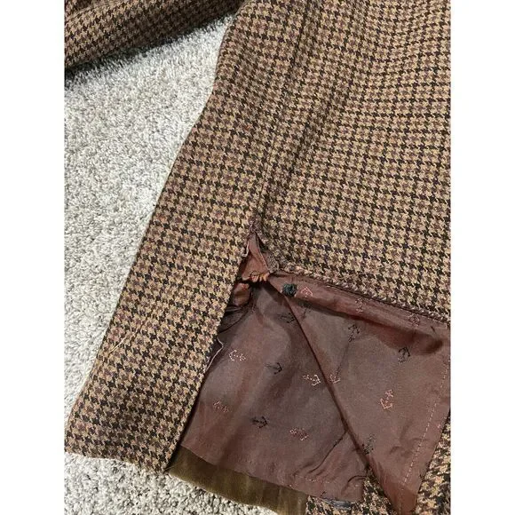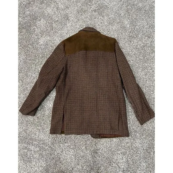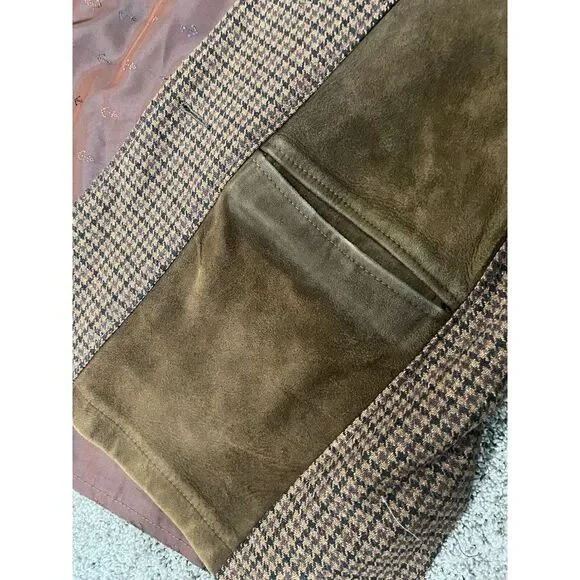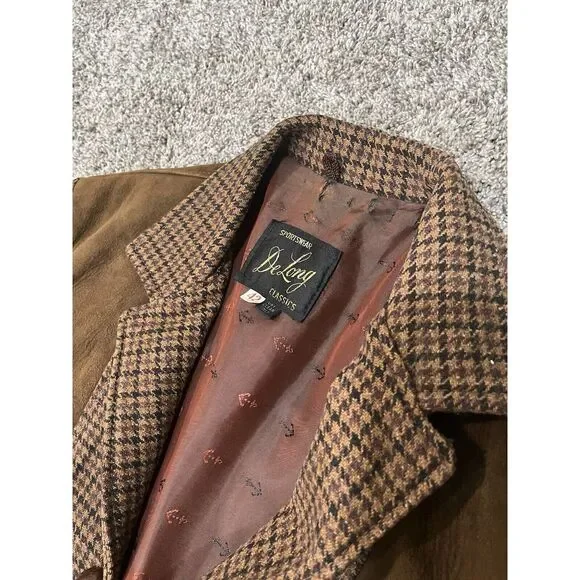 This vintage DeLong Sportswear jacket from the 1960s features a brown houndstooth pattern with wool and suede outer shell materials. It has an embroidered accents, button closure, and a short length. The jacket is designed in a 2-tone style with a regular fit, suitable for both men and women. Ideal for winter, fall, and spring seasons, it exudes a classic 60s vintage vibe.Very rare! Look at images for condition
