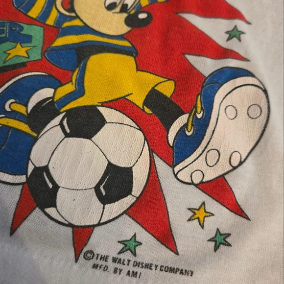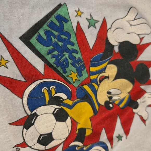 Vintage 1990s Disney Mickey Mouse Soccer Star Red and White Short Sleeve Tee.Made in USA.Brand: The Walt Disney CompanySize: Tagged 4T, best fits a modern 2-3TCondition: Good gently used, minor signs of wear Pit to pit: 11"Length: 11"New to ? Use my referral code RETRO_RESTYLED when you sign up to get $10 off your purchase! tags vtg, retro, wholesome, classic, disneyworld, disneyland, 90s, throwback, whimsical, whimsy, unique, nostalgia, rare, htf, collectible, nostalgic, sports, athleticbin p