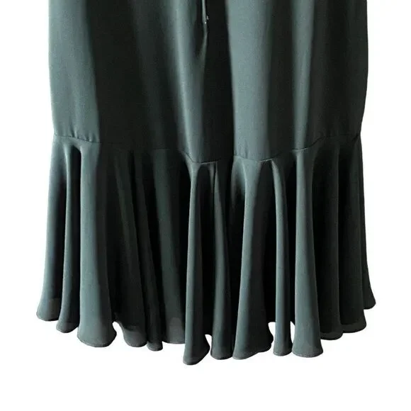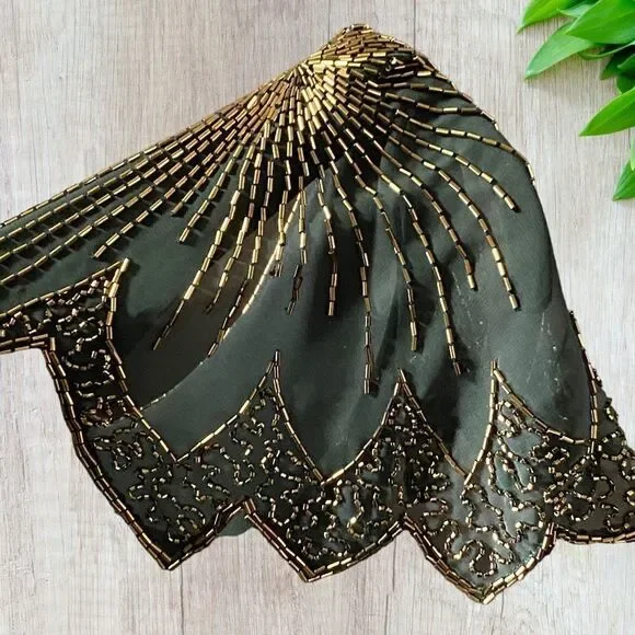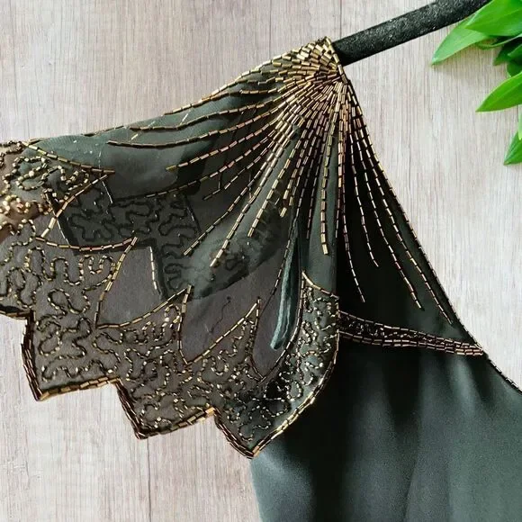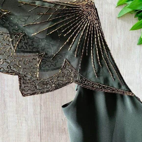 Roger Milot for Jo Ed Sophisticates. Stunning black dress with glass bead embellishments at the sleeve and shoulder that make this a one of a kind look. Vintage to the 60’s but the drop waist with a ruffle edge, takes it back to the 20’s. Fully linedChiffon Vintage size 6Current size 2/4Length 41”Bust 34”TagsHolidayLittle black dressNew Year’s EveChristmasPartyCocktailsTwenties