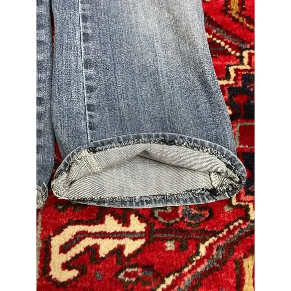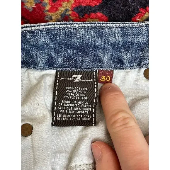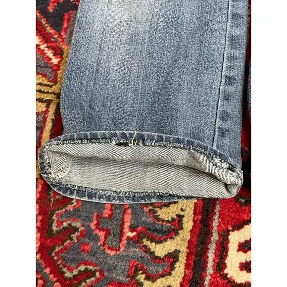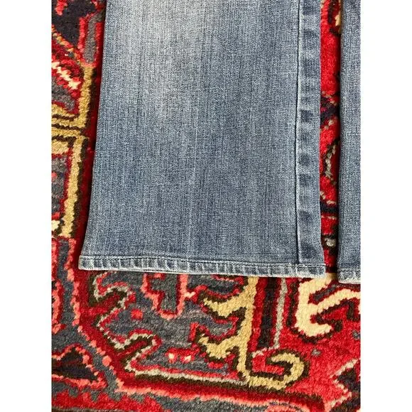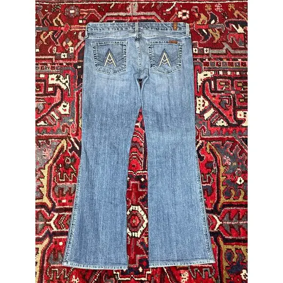 Vintage 7 For All Mankind Women’s Jeans A Pocket Y2K Super cool 7 For All Mankind A Pocket Women’s jeans!These jeans have a flared look to themThe bottom cuffs have been hemmed with the original hem attachedLight to medium wash98% cotton, 2% spandexGood used condition with no rips or stainsWomens tag size 30Actual waist- 34”Inseam- 27”Rise- 8.5”Super cool, vintage "A" pocket Jeans!