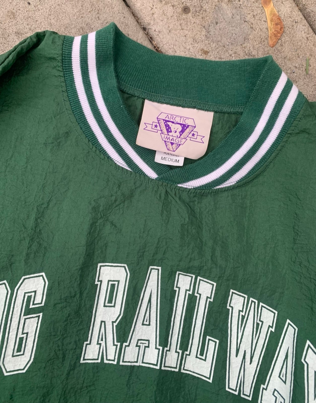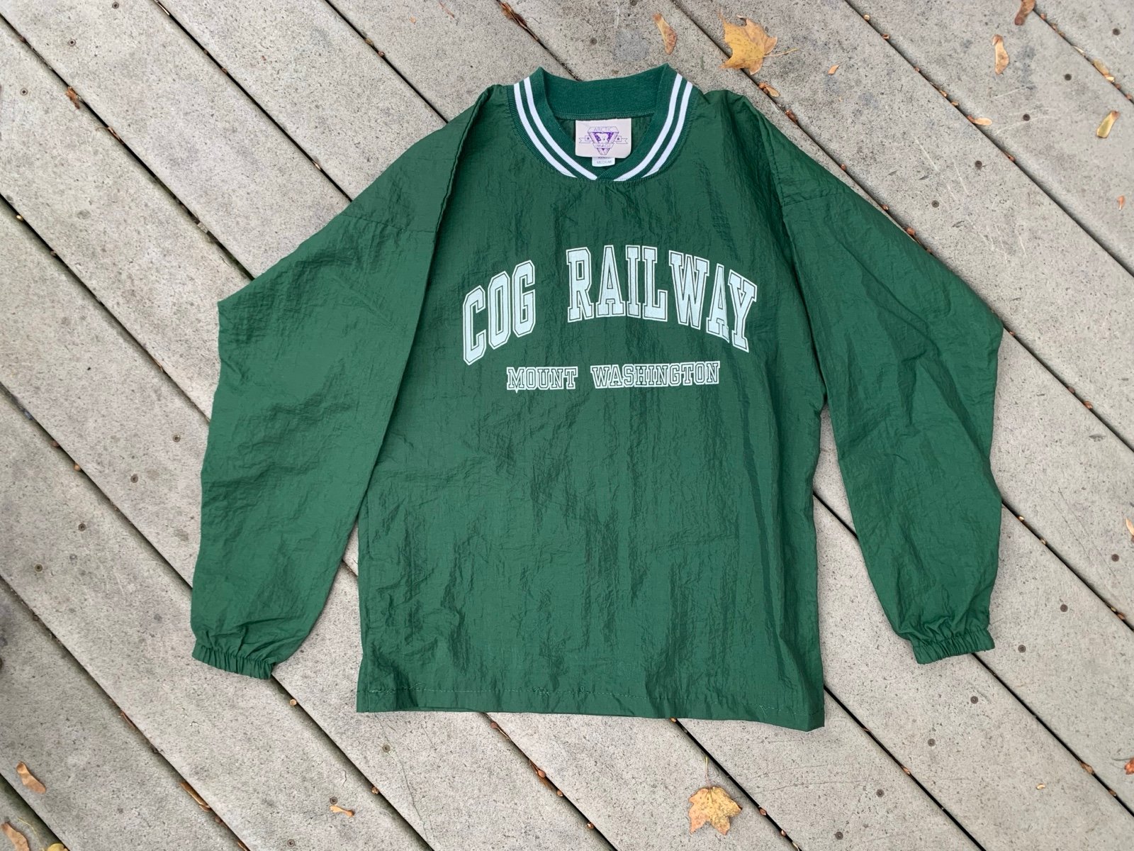 Green and white Cog Railway windbreaker! This is from New Hampshire. This is totally 1990’s. Great silky windbreaker material, featuring a relaxed fit. No major flaws. Tagged medium but refer to measurements below.