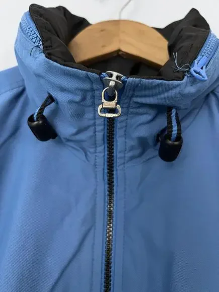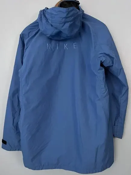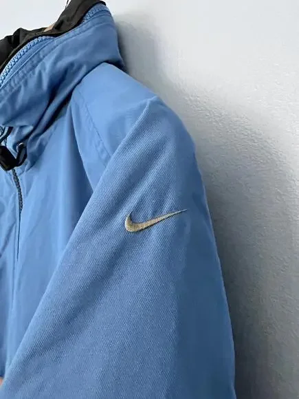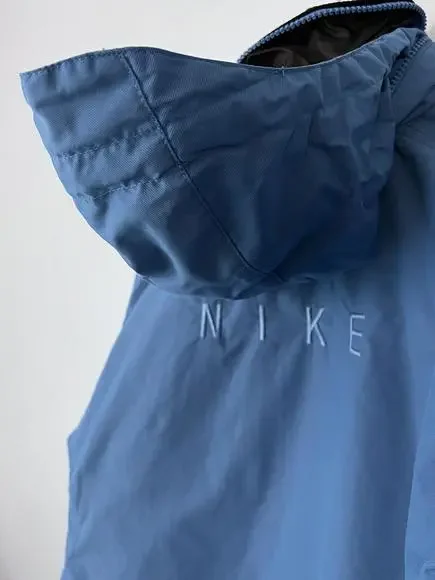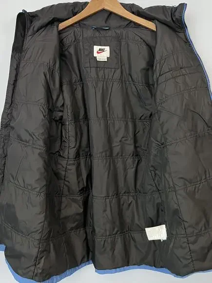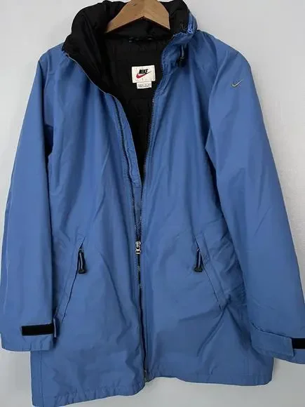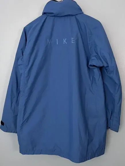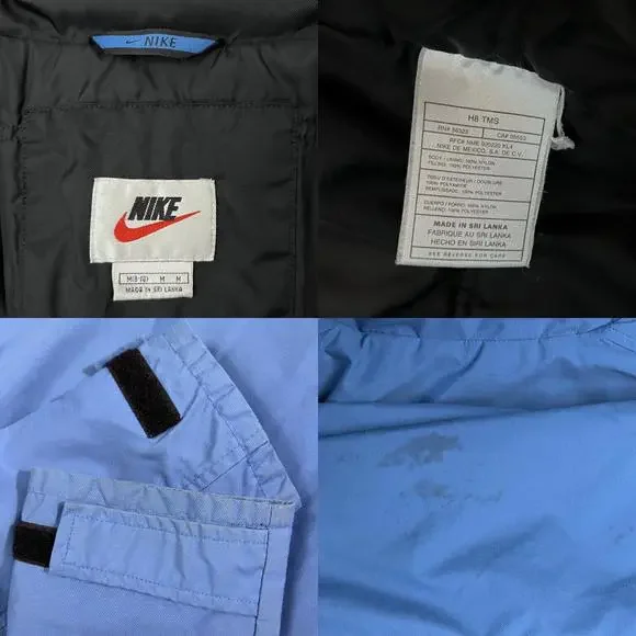 Vintage 90s Nike Puffer Jacket Long White Tag Blue H8 TMS Sz M (8-10). The main zipper pull is broken/missing. Still zips just fine, will just need a replacement to make it a bit easier to grip. Swoosh embroidery on the left sleeve, NIKE spellout embroidery on the back top middle. Hideaway hood in the collar! Some cuff wear and staining on the right arm, nothing too drastic. Double check measurements below to ensure proper fit as todays sizing is a little different than in the past.Weighs: 1lb 8.8ozMeasurements, laying flat:Pit to pit: 21”Front length, collar to bottom: 27”Back length, collar to bottom: 30”Sleeve length from pit: 20”Collar: 4”