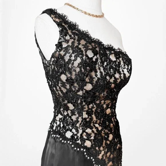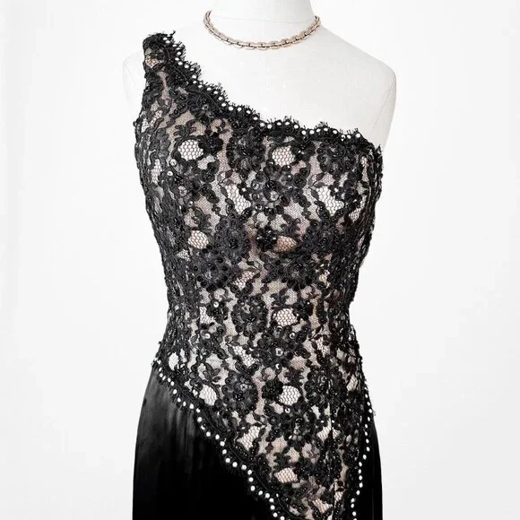 Vintage Black Satin Lace Beaded One Shoulder Bodycon Maxi Cocktail Prom Dress