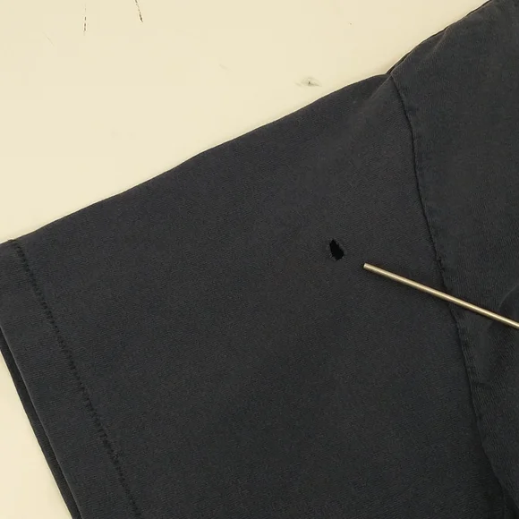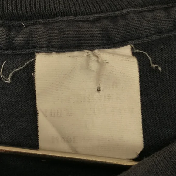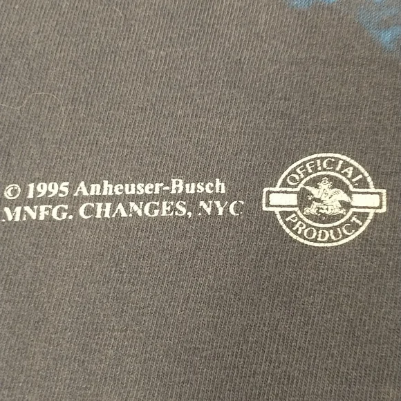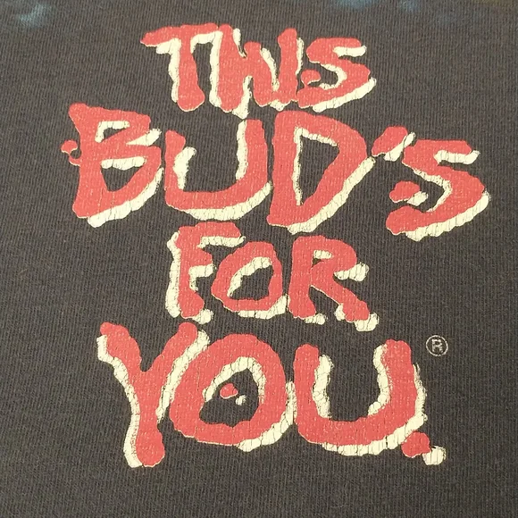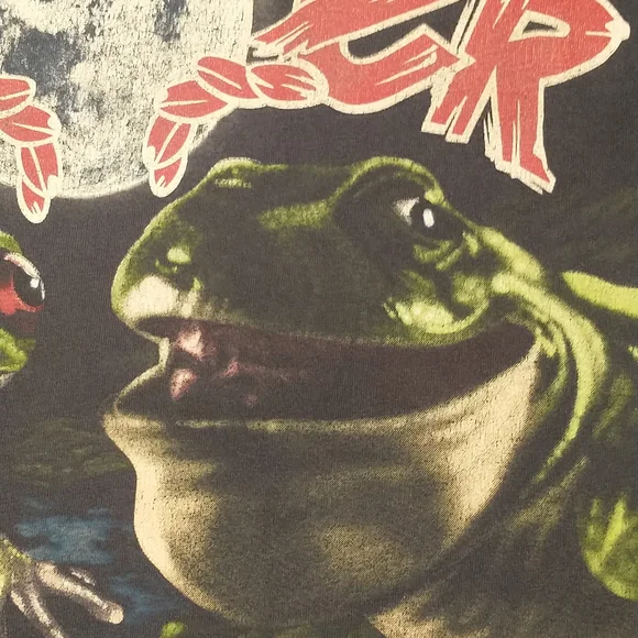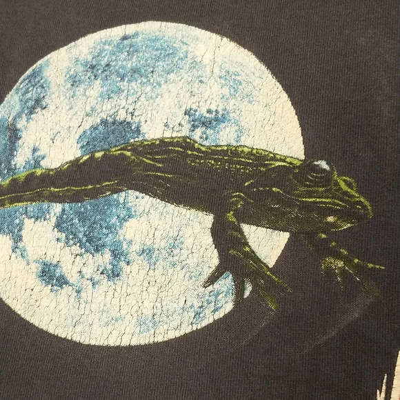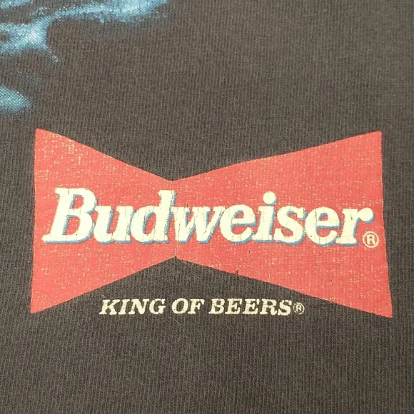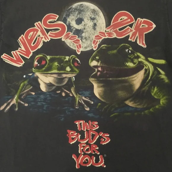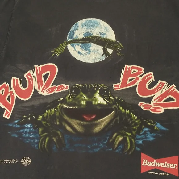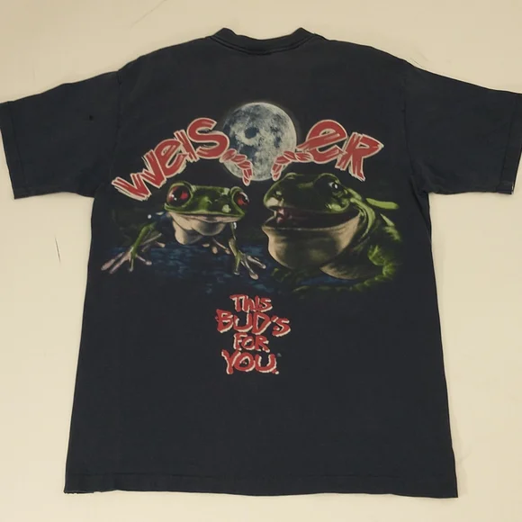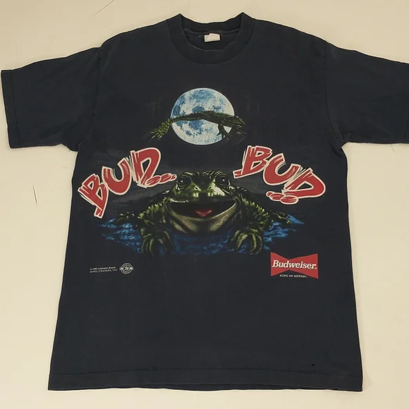 Faded dark blueish black cotton t shirt, vintage nineties. Great graphic frogs and a full moon Budweiser King of Beers, official product. Made in USA, 100 cotton, single stitch. Large front and back graphics. Condition sweat and food stain free, a couple holes - see pics, white paint on the edge of the right sleeve. Evenly faded, light natural wear. Presents well. Measured flat unstretched 28.5", pit to pit 20.5". Mid/heavy weight. Size marked L, made in USA ( wash faded label). Unisex men's or women's.