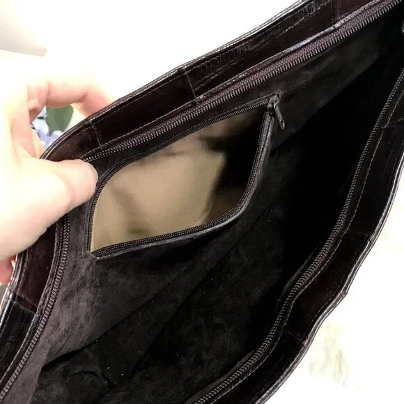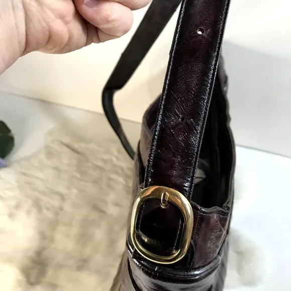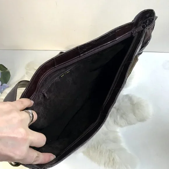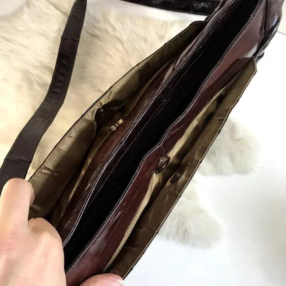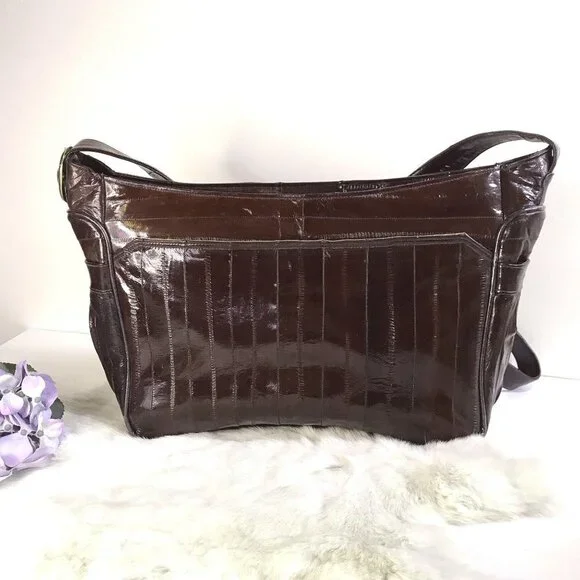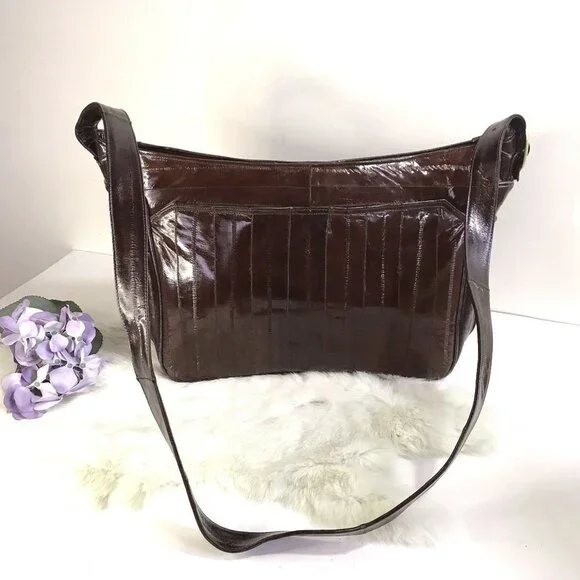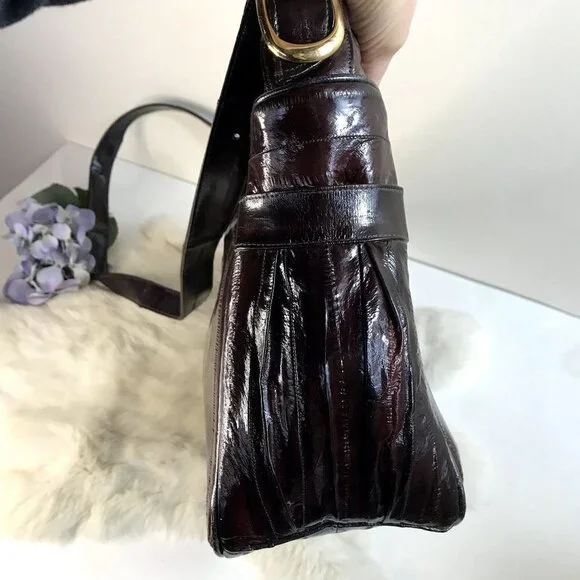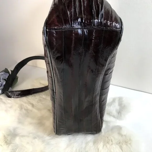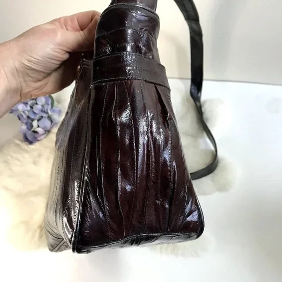 Vintage Genuine Eelskin Deep Mauve Shoulder Bag. Unused, 1960s, original vintage oblong, rectangular-shaped women's purse completely lined in super-soft, dark pig suede. Single zipper top, 3-inch adjustable, wide, shoulder strap. Interior zipper pocket. Soft, pleated sides, trimmed in piping on edges. Structured, stiff bag. The color is a very deep mauve, a unique blend between brown, red, and purple.Width is 15 inches at top and tapers to 11 inches at the base.Please check your measurements to determine your fit. Please message with any questions before purchase.Features:• Medium Size• Bohemian, Designer Style• 1960-70s Era• # of card pockets: 0• # of interior compartments: 1• Solid• Made in Korea• # of exterior pockets: 0• Adjustable strap? YES• Studded feet? NoSize: Womens MediumMeasurements are approximateWidth 15 in / 38 cmHeight 9 in / 23 cmDepth 4.5 in / 11 cmStrap Drop 18 in / 46 cmCondition: Pre-Owned Like NewPreowned, like new vintage condition, unused condition. This bag is in mint, pristine condition and it has never been used. It has been stored in a way that preserves the beauty of the color and unique eel-skin leather. Thank you for viewing this listing. See our profile for other great items. Bundle and save on shipping.