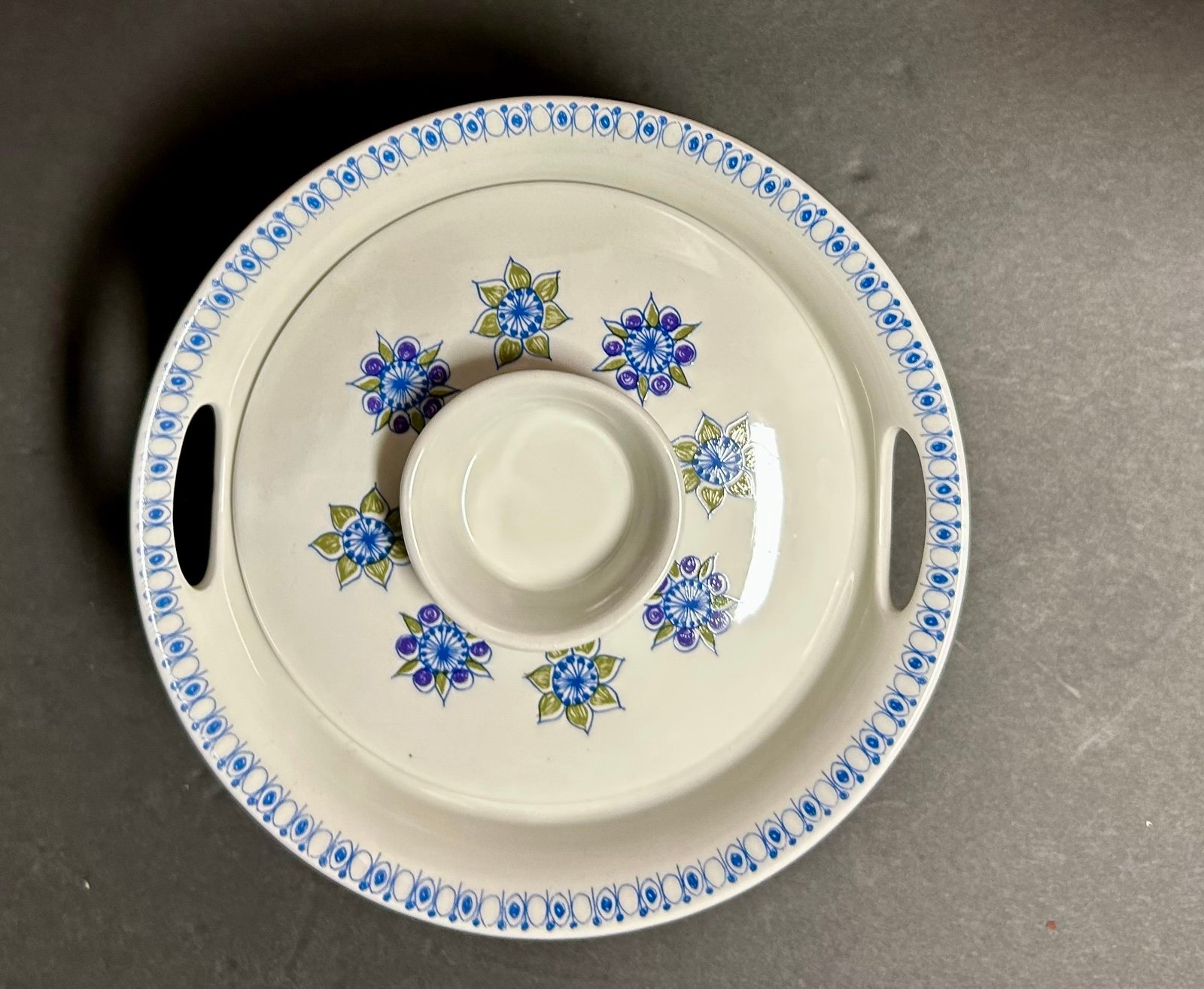 This is a vintage Figgjo Flint Turi Lotte covered dish from Norway. It is round with a multicolor design, made of porcelain, and features handles. The dish has a diameter of 7.5 inches, a height of 4 inches, and a weight of 2 pounds. It is a two-handled serving dish with a printed backstamp, perfect for serving and decorative purposes.