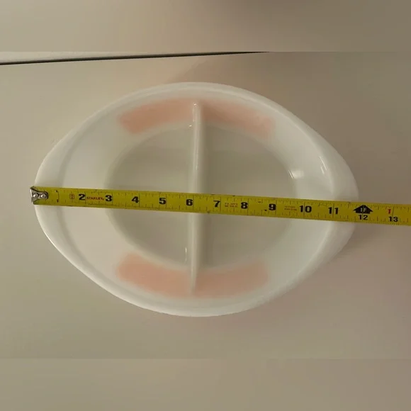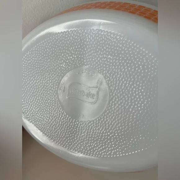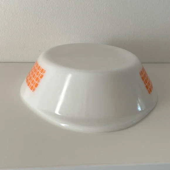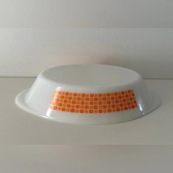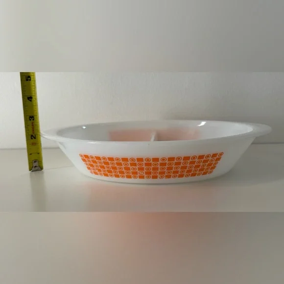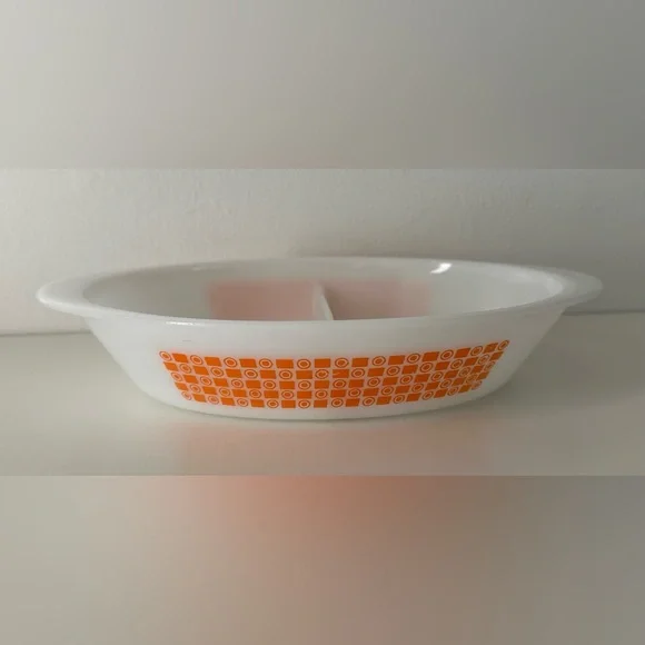 Super cool vintage Glasbake Jeanette J2352 orange square & dot promotional pattern divided dish. Amazing retro mid century 70s piece that’s relatively hard to find.Very good vintage condition. A few minor scuffs to the pattern on the outside of the dish that aren’t noticeable unless you’re looking very closely. Measures 12 inches long by 8.5 inches wide by roughly 2.25 inches tall. See photos for condition and exact measurements.Feel free to reach out with any questions or offers, and please do take a look at my other available items - I have lots more like this and I’m always happy to combine shipping!