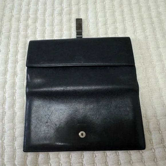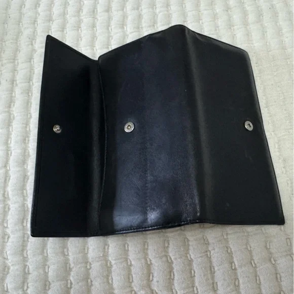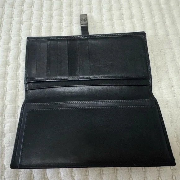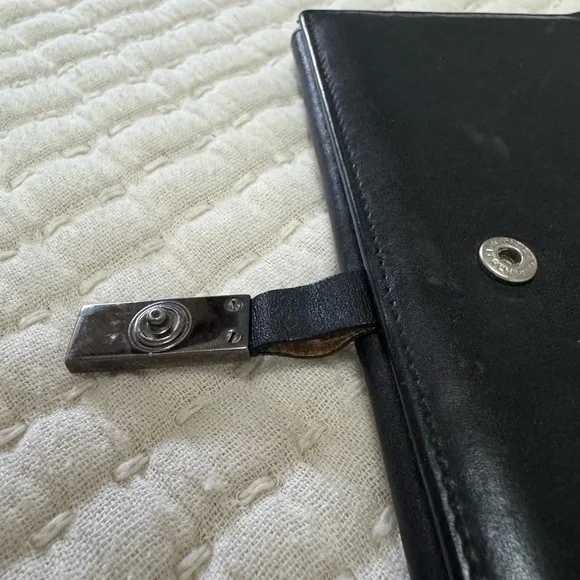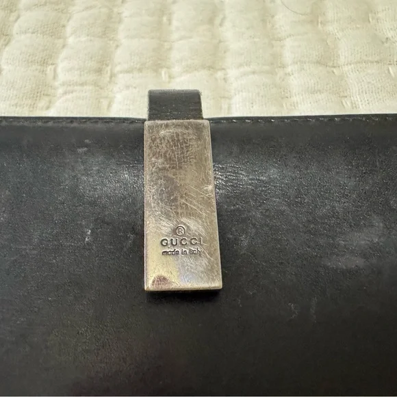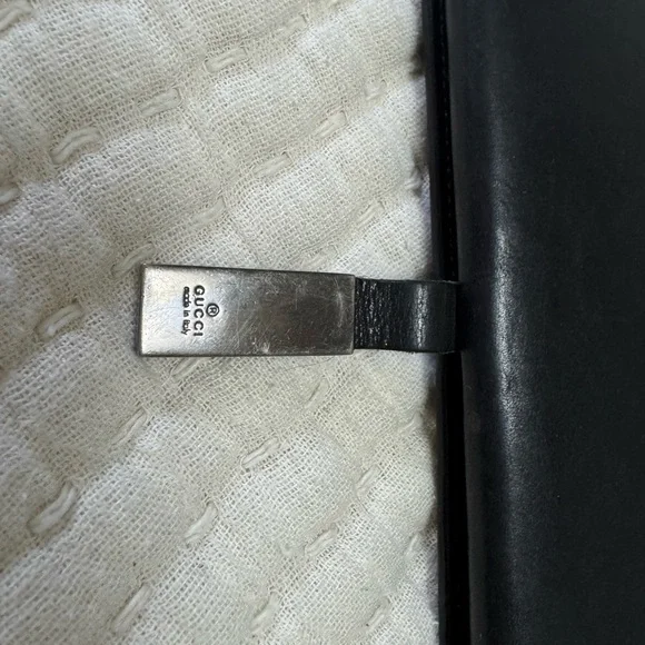 Gucci Black Leather Wallet with Silver Tone Hardware Snap Closure.Exterior Pocket with Snap Closure Leather Lining Four Interior Pockets with Card Slots.Moderate Scratches and Scuffs Leather Separating at Closure.Please keep in mind this piece has had a previous life and may tell its story through minor imperfections.Purchasing this item continues its story making a positive choice for the planet.