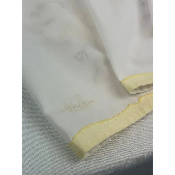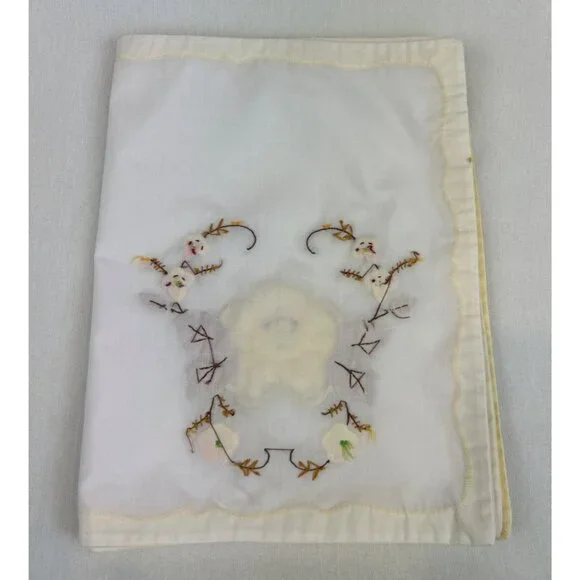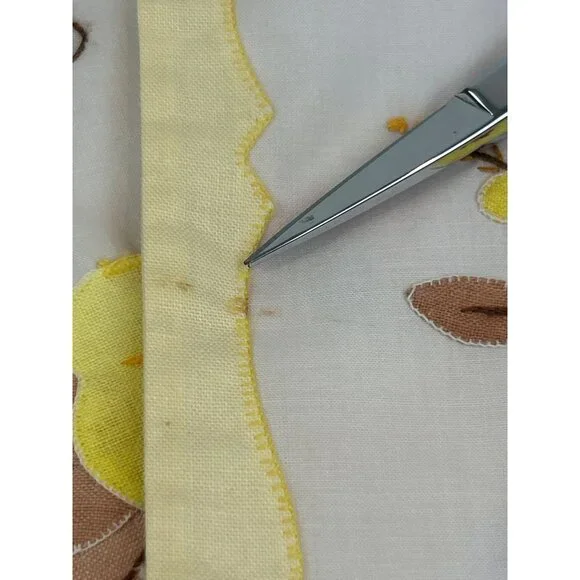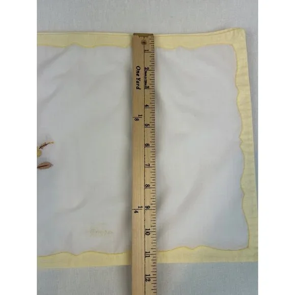 This vintage set of 4 linen placemats showcases charming hand-embroidered floral designs with yellow, brown, and orange hues. A beautiful addition to nostalgic table settings.• Set of 4 placemats• Hand-embroidered floral design• Yellow scalloped edge• Lightweight linen material• Measures approx. 18" x 11.5"Minor discoloration spots on a few of the placemats, adds character to its vintage charm.