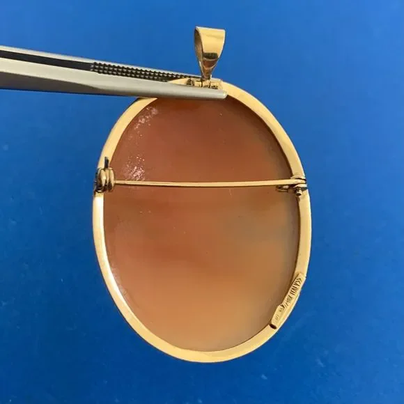 * Vintage Italy 18K Yellow Gold Oval Carved Cameo Statement Brooch Pendant* Length including bale: 1-3/4”* Width: 1-1/4”* Weight: 6.3g* Cameo measures: 1-3/8” by 1-1/8”* Marked: 377 MA 18k Italy Makers Mark* Condition: As picture. * Chain is not included, but can be purchased for an additional price.* G3854