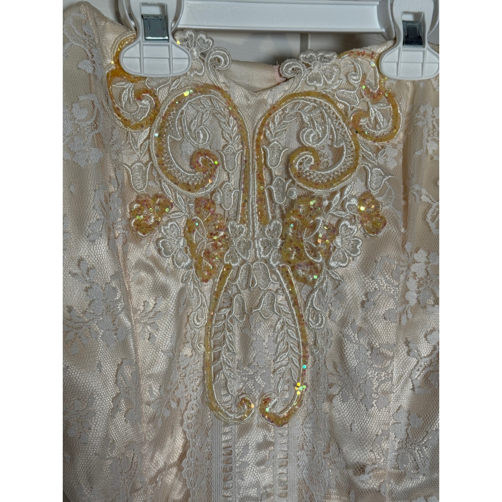 Elegant Jessica McClintock Gunnesax vintage strapless dress, Size 9, exhibiting an intricate lace overlay in a soft cream hue, fully lined. The bodice is accentuated with delicate gold-toned sequins and embellishments. It features a flattering drop waist silhouette with an asymmetrical, scalloped hemline that provides a unique and stylish flair. Perfect for formal occasions, vintage-themed parties, wedding, or a special evening event.
