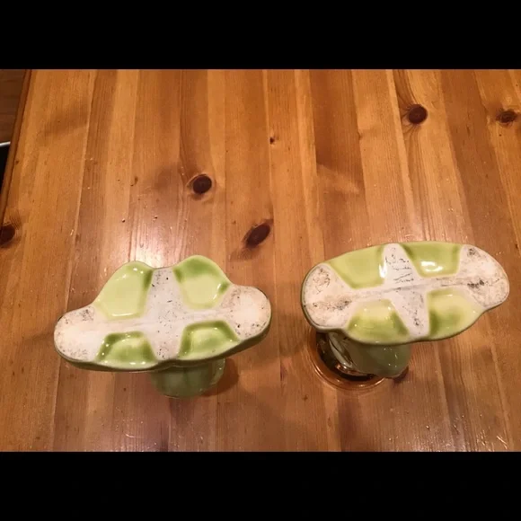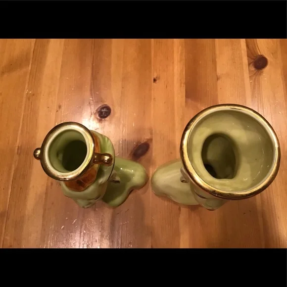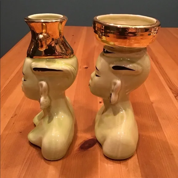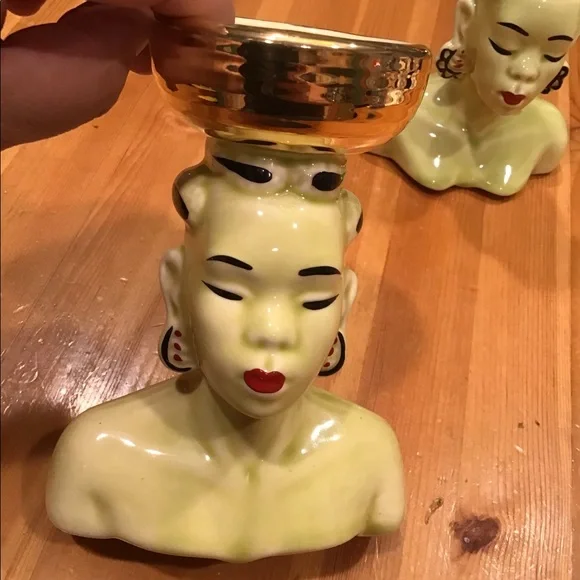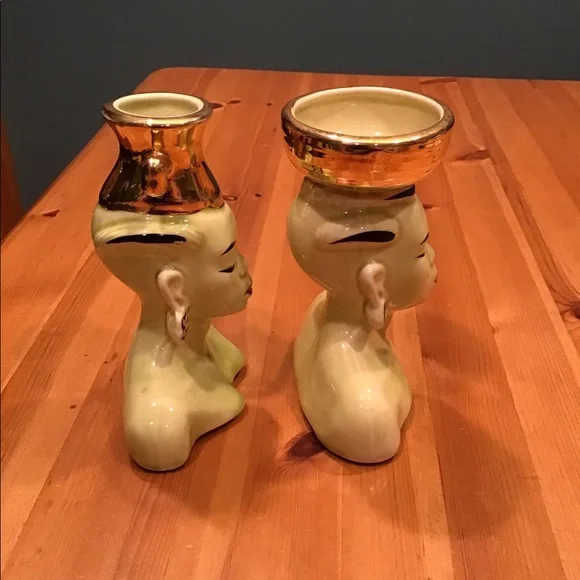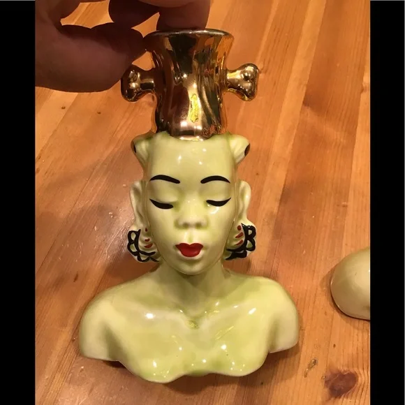 This lot of 2 amazing mid century lady head vases are from Joan Lea, & depict two African women wearing gold headdresses & earrings. Measuring 6”x4-1/2” & 6”x4-1/4”, these two Nubian, ruby lipped goddesses are in a chartreuse green glaze, which is more scarce to find, & a definite conversation starter! They’re in EVC with no chips or cracks, the gold paint is still intact when most times that fades away with use. The black hand painted cold paint on the sides of the hair have very minimal wear, please see pics for incredible condition. These two beauties make an incredible addition to your collection, & not only can they hold flowers, but they can be used for dining holding breadsticks or skewers, & they’re perfect for use at the vanity storing makeup brushes as well!* I don’t issue returns or partial refunds, so please view pics & read description thoughtfully, thanks for understanding!