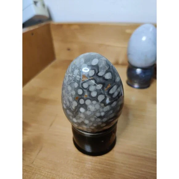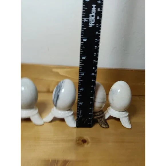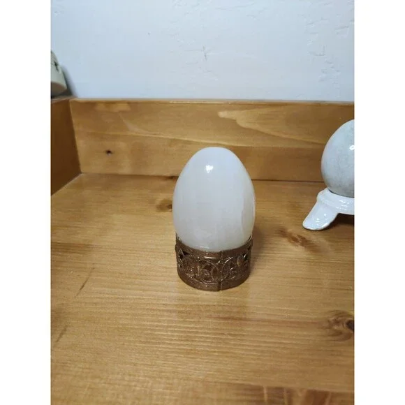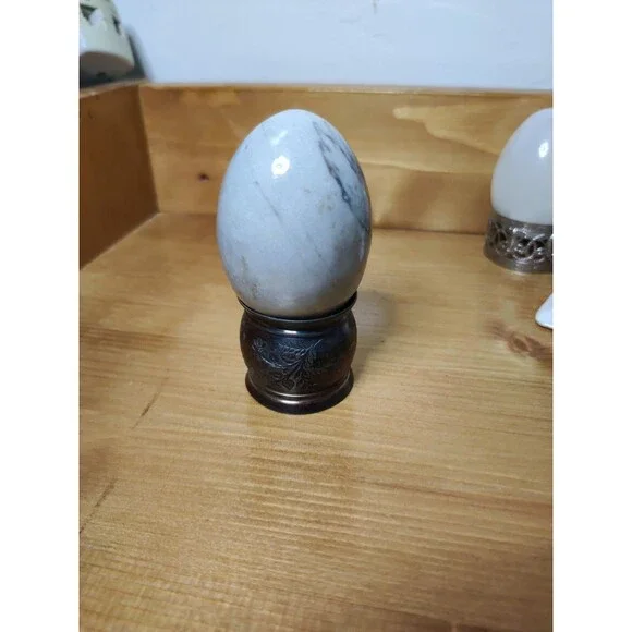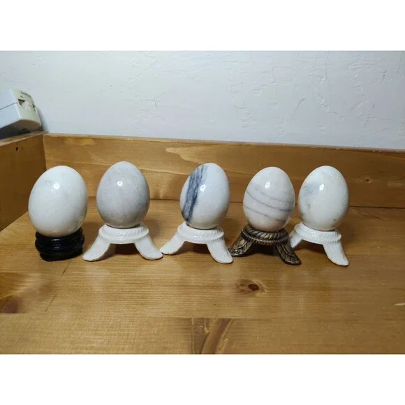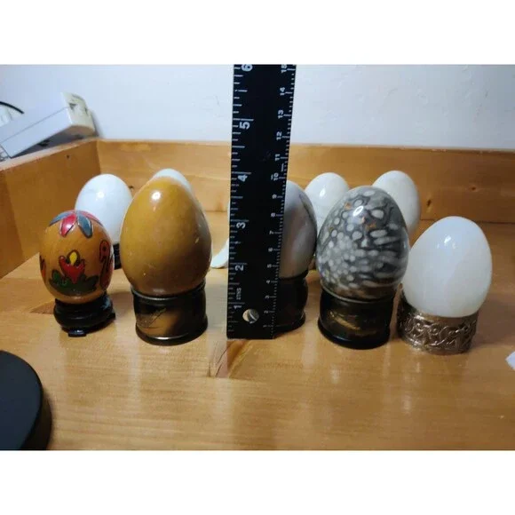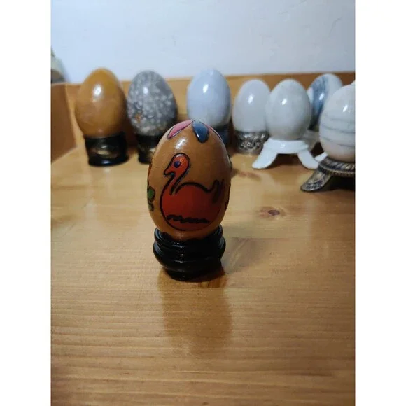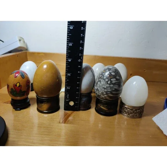 Add a touch of vintage charm to your Easter decor with this lot of 10 hand-carved alabaster eggs. Each egg is unique, with a marbled pattern and an oval shape that makes them perfect for any room. The eggs are made of high-quality materials such as alabaster, wood, marble, and stone, and are polished to give them a beautiful finish.These eggs come with 11 stands, making them easy to display. They are perfect for collectors and those who appreciate handcrafted items. The eggs are clean with a damp cloth and are ready to be placed in any room. Get your hands on these beautiful vintage eggs and add a touch of Easter to your home decor!